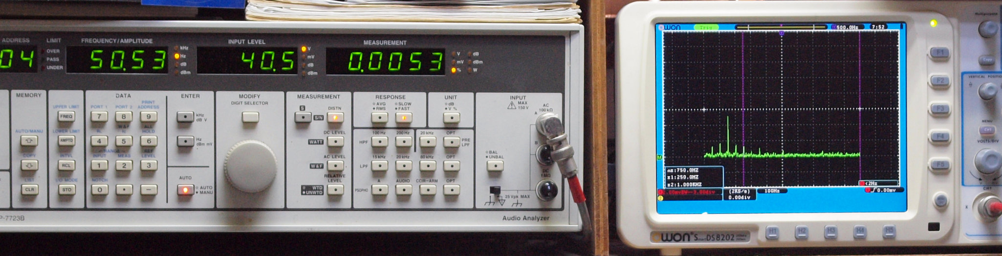 | E1. 50Hz入力、SP出力電圧40V=200W出力、 0.0053%歪み。 「FFT分析」のオシロのカーソル周波数、左=250Hz、右=1kHz。 |