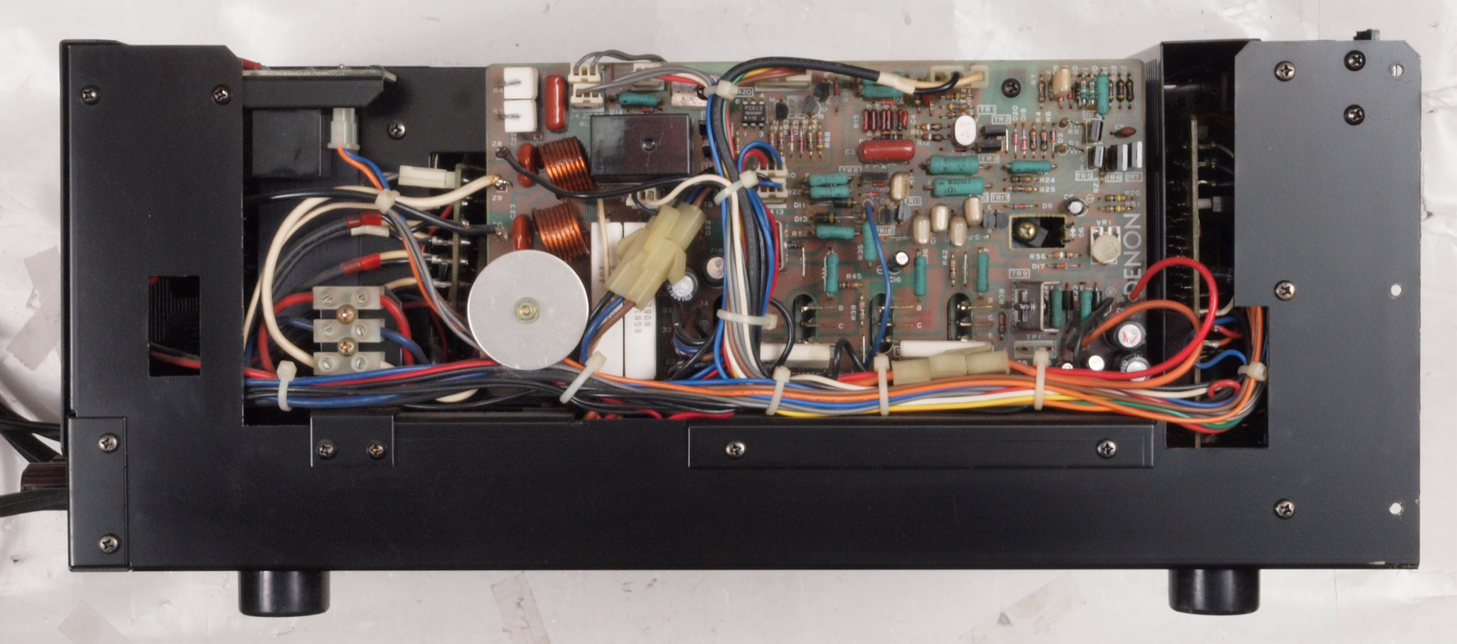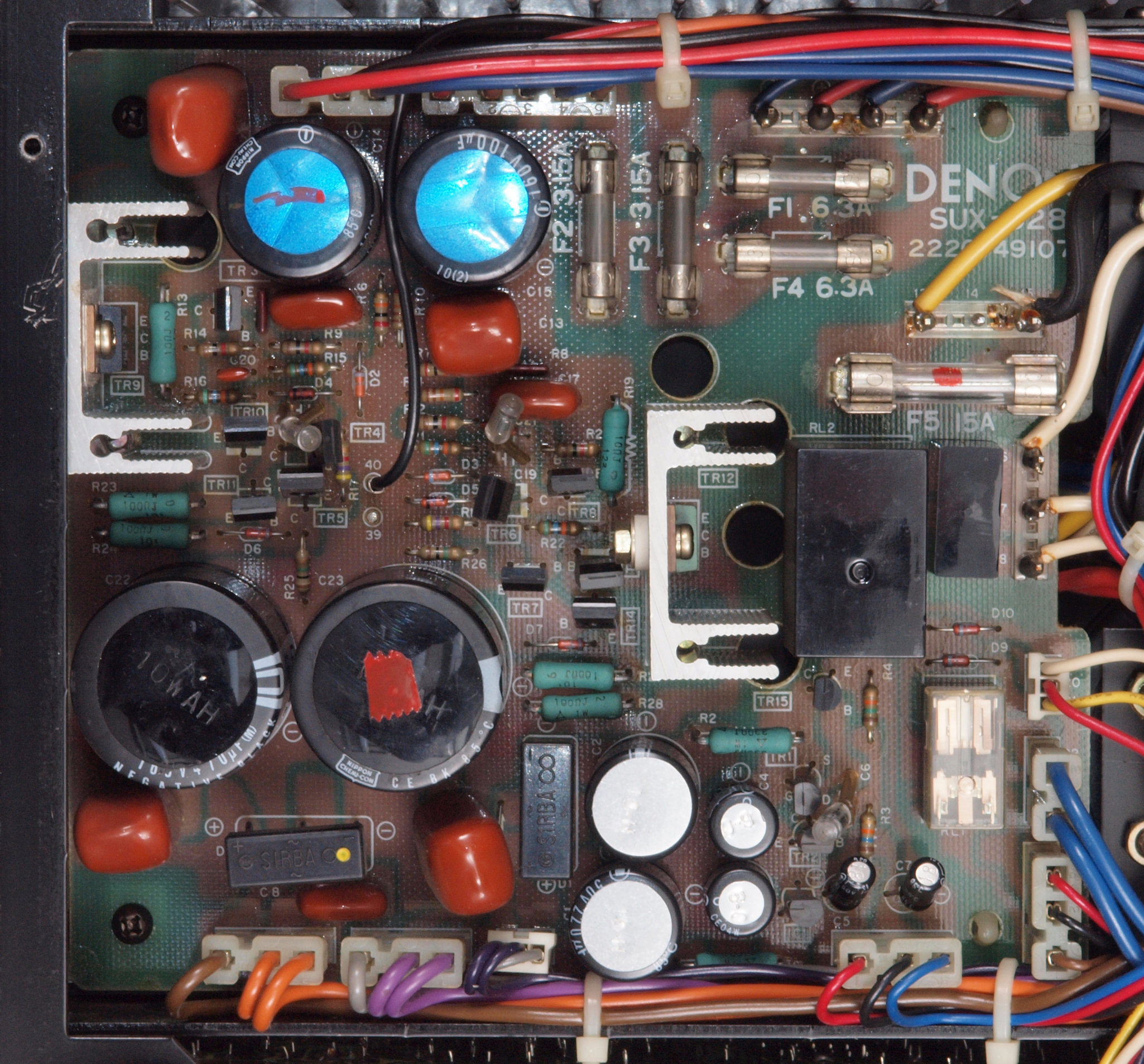 | CB2. 修理後 電源ブロック電解コンデンサー下配線。 フイルムコンデンサー2個追加。 フイルムコンデンサー取付ビスは塗装ビスからメッキビスに交換する。 |