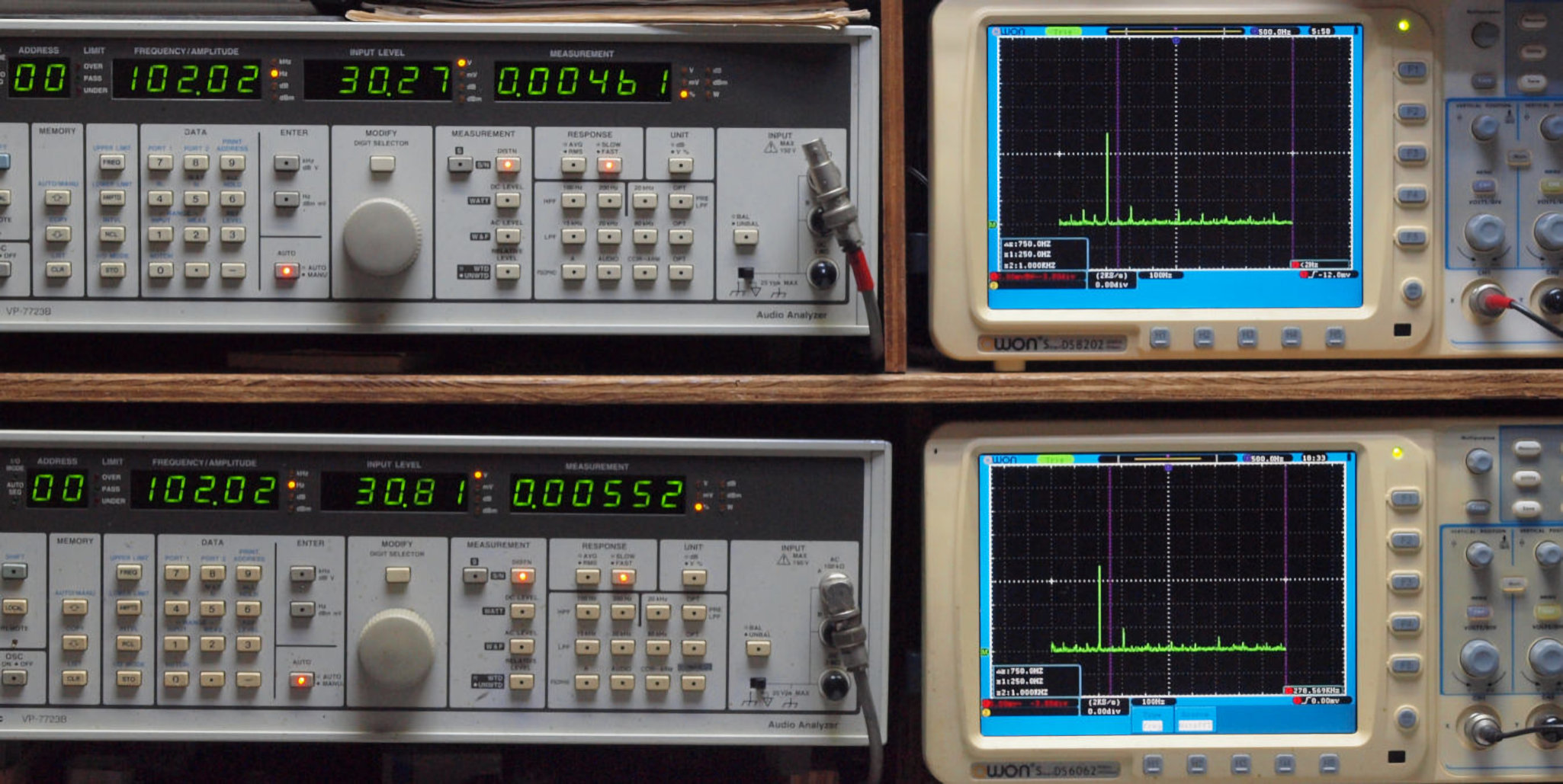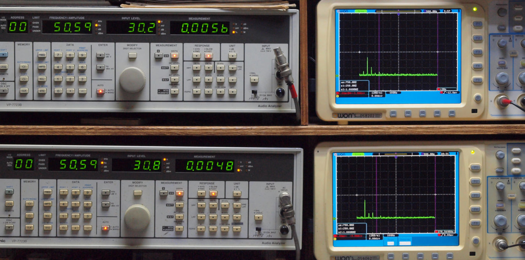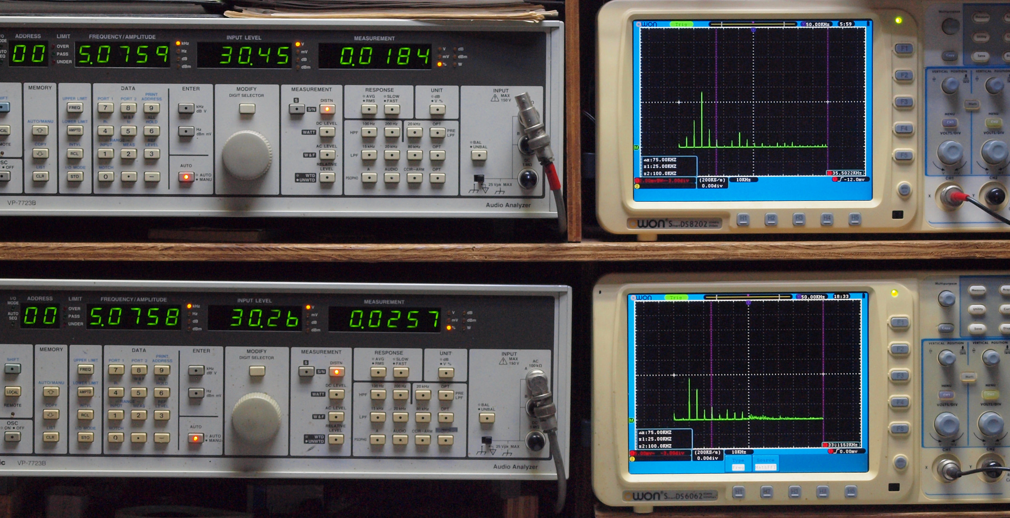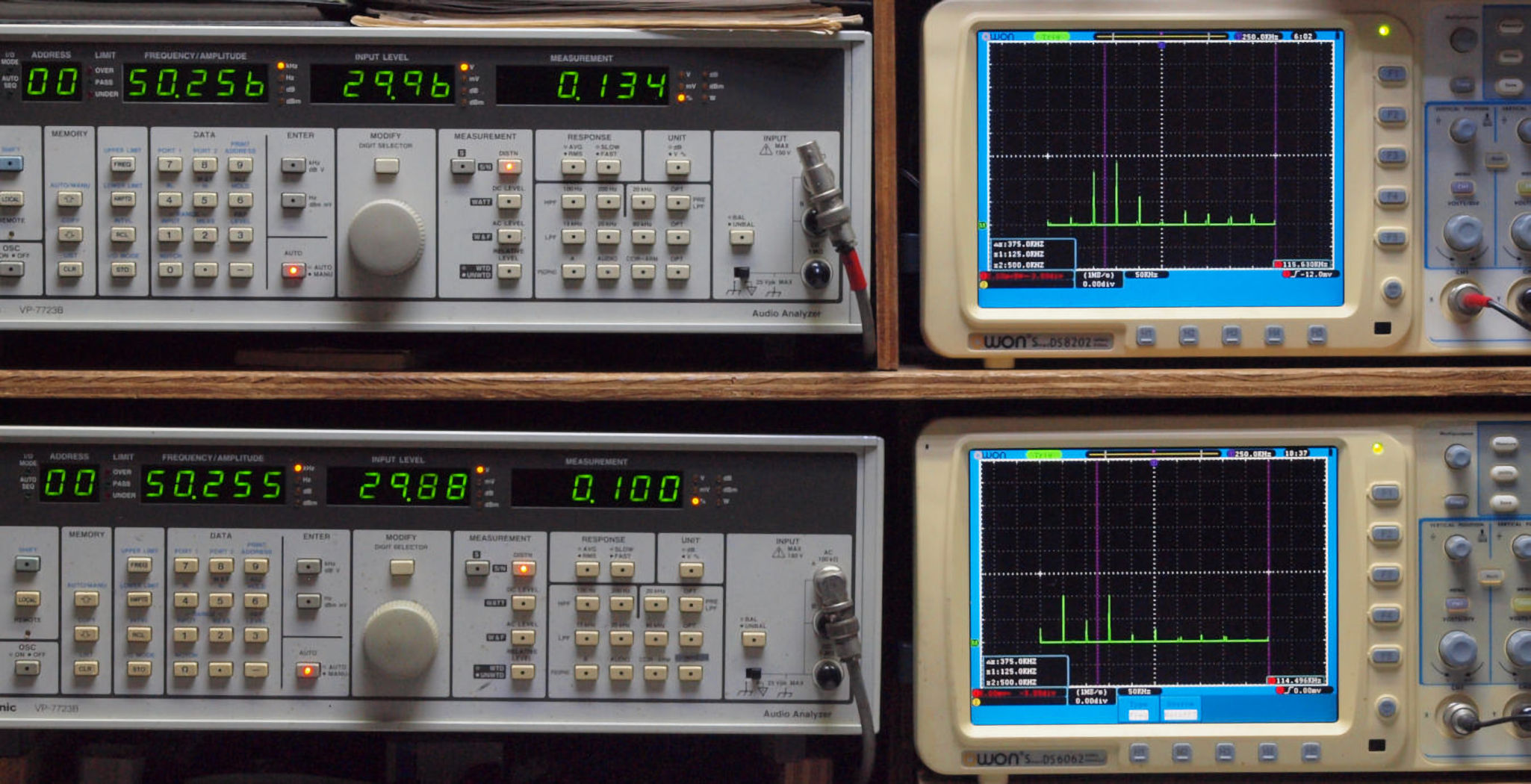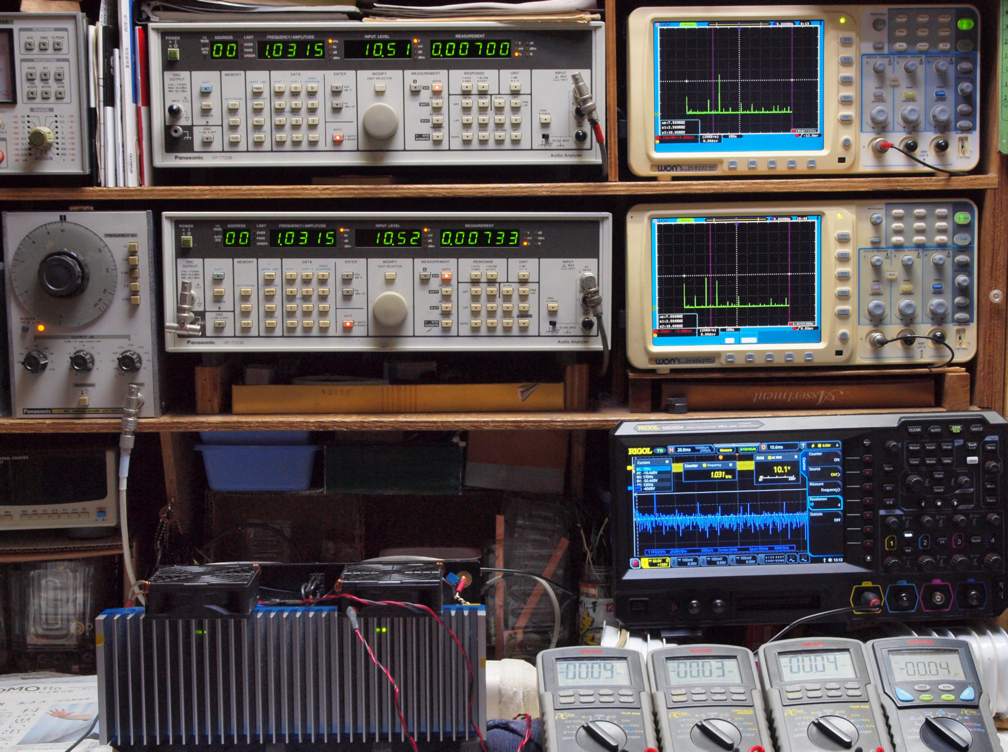 | E. 測定・調整。 画像をクリックすると、大きく(横幅2050ドット)表示されます。 E0. 出力・歪み率測定・調整。 使用電圧は100V/50Hz、よって定格出力 200W RMS×100V/117V=170.9W RMS。 「見方」。 上段中 右側SP出力を「Audio Analyzer Panasonic VP−7723B」により測定。 表示LED、 左端=メモリーNo、 中左=周波数測定、 中右=出力電圧測定、 右端=歪み率測定。 上段右端 VP−7723Bの基本波除去出力を「owon SDS8202(200MHZ)」で「FFT分析」表示。 下段中 左側SP出力を「Audio Analyzer Panasonic VP−7723B」により測定。 表示LED、 左端=メモリーNo、 中左=周波数測定、 中右=出力電圧測定、 右端=歪み率測定。 下段右端 VP−7723Bの基本波除去出力を「owon SDS6062(200MHZ)」で「FFT分析」表示。 下段左端 オーディオ発振器 VP−7201A より50Hz〜100kHzの信号を出し(歪み率=約0.003%)、ATT+分配器を通し、AMPに入力。 よって、ダイアル設定出力レベルより低くなります。測定機器の仕様や整備の様子はこちら、「VP−7723B」「VP−7201A」。 FFT画面の見方はこちら。 |