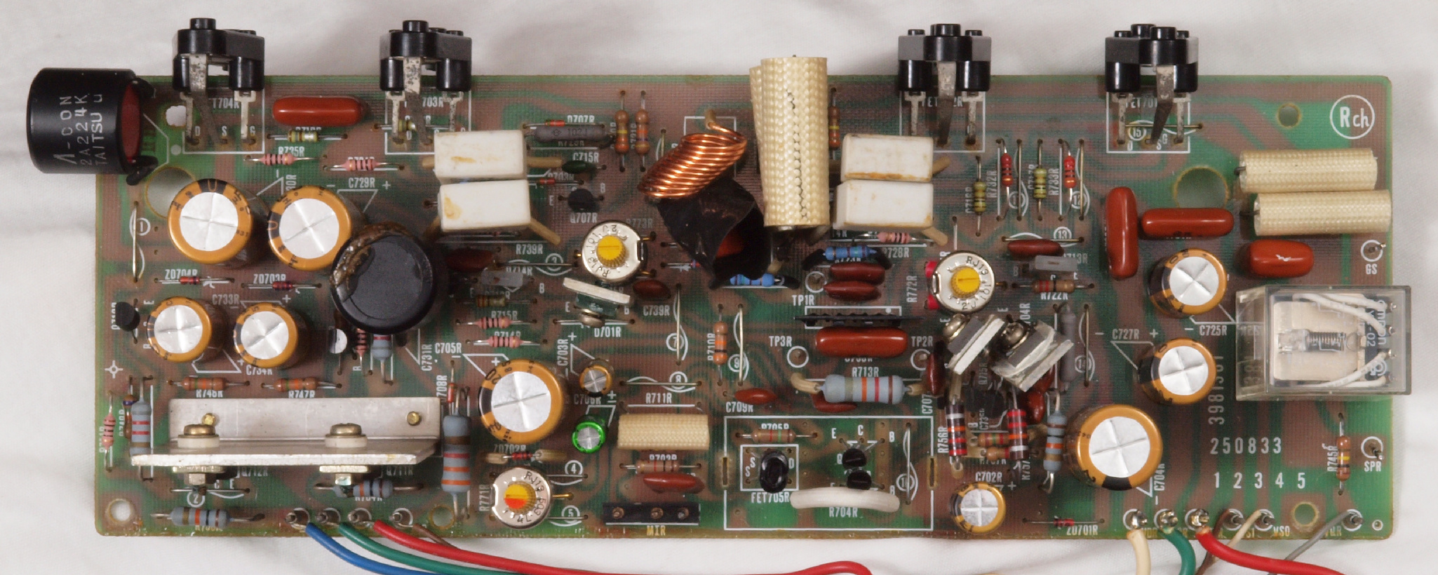 | C12. 修理後 R側ドライブ基板。 初段FET、バランス・バイアス調整用半固定VR3個、SP接続リレー交換 ヒューズ入り抵抗全部、電解コンデンサー11個、足黒TR(トランジスター)1個交換。 |