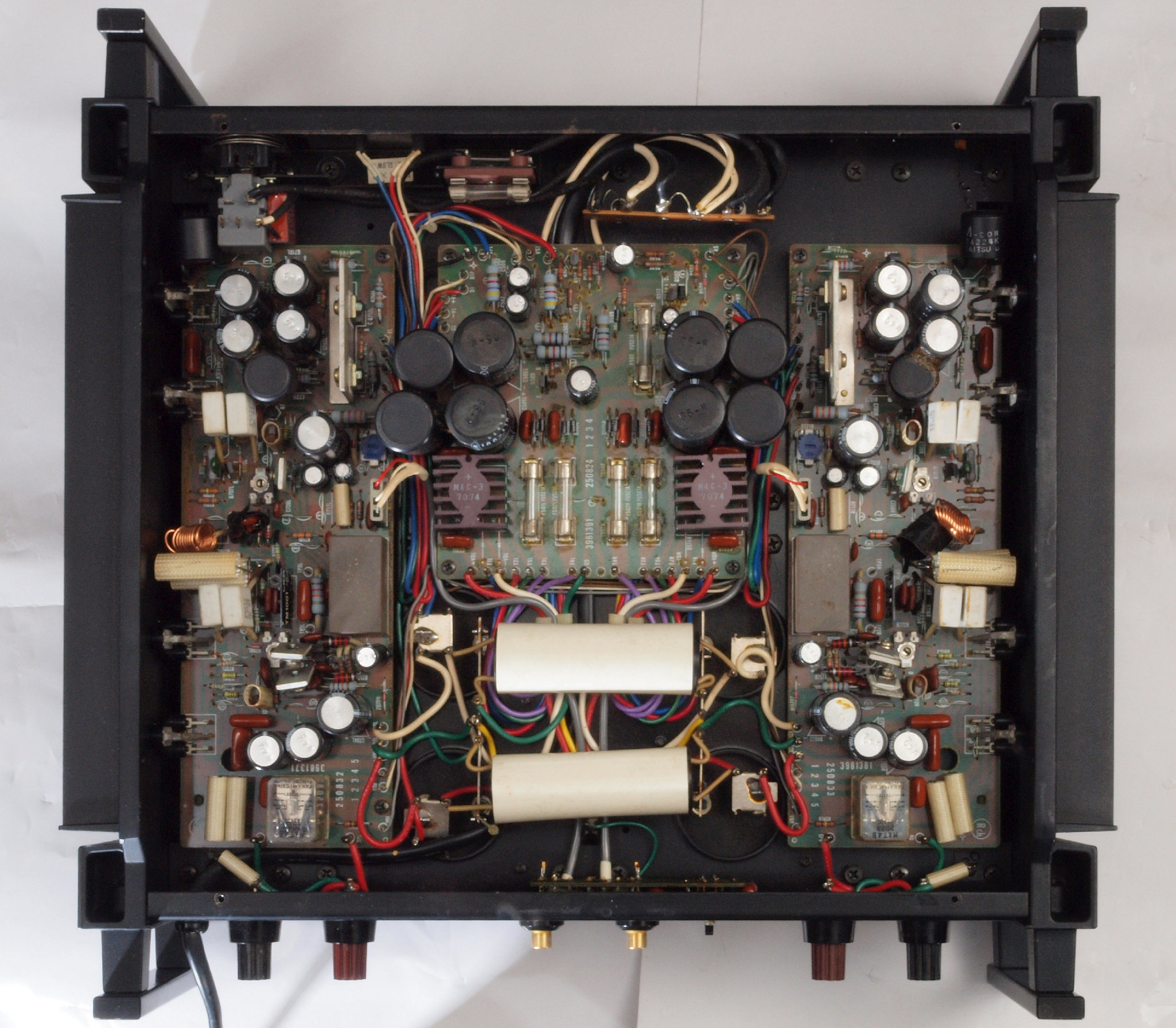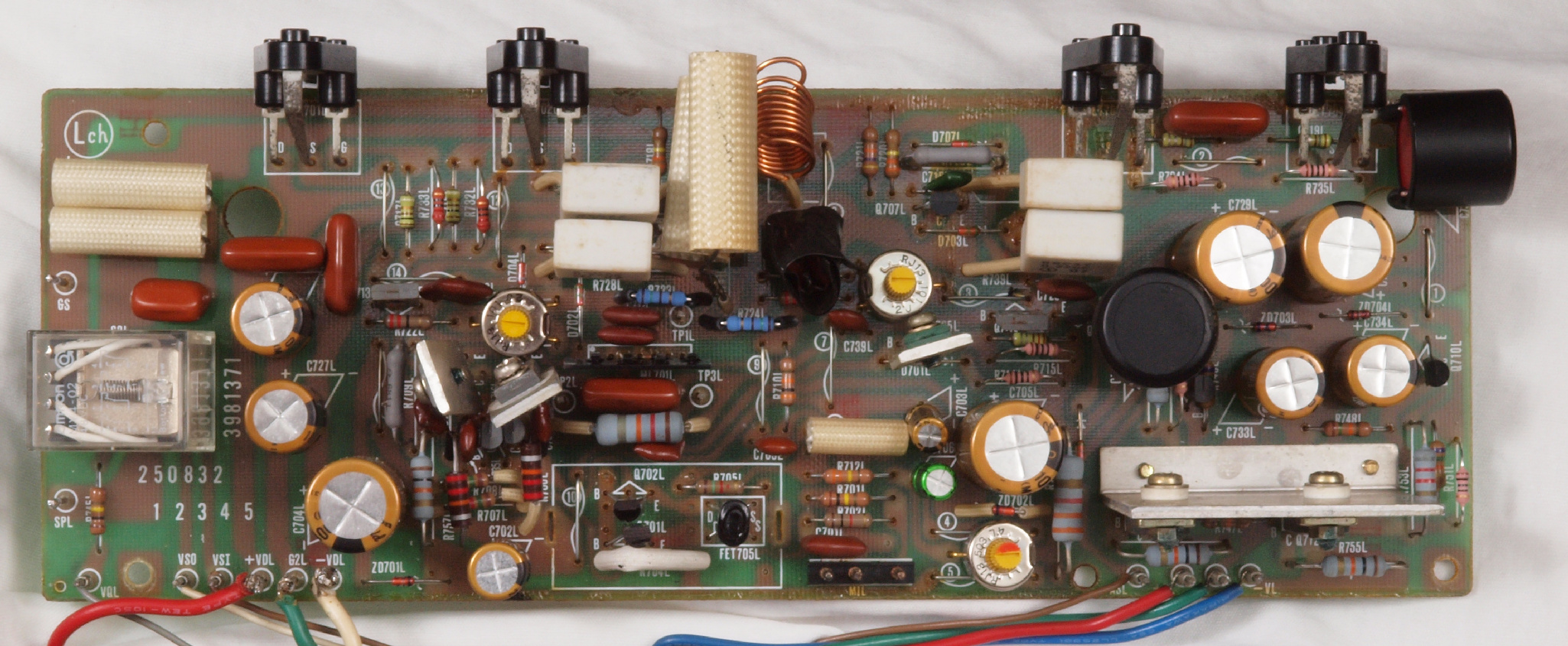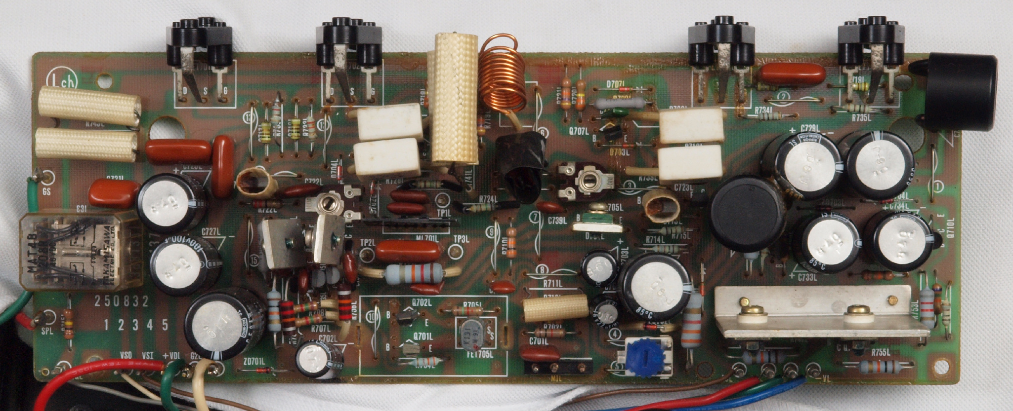 | C22. 修理後 L側ドライブ基板。 初段FET、バランス/バイアス調整用半固定VR3個、SP接続リレー交換 ヒューズ入り抵抗全部、電解コンデンサー11個、足黒TR(トランジスター)1個交換。 |