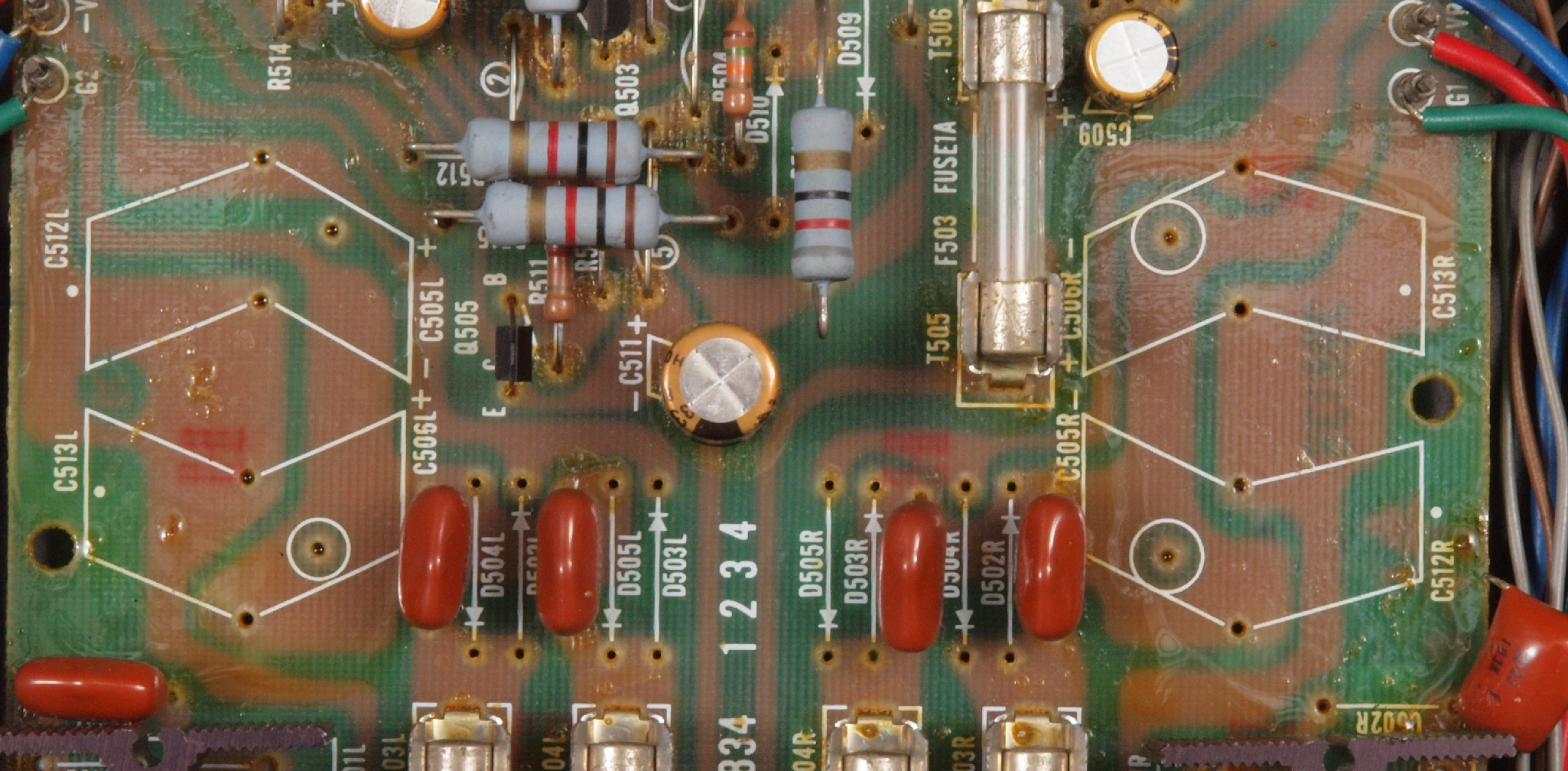 | C. 修理状況。 画像をクリックすると、大きく(横幅2050ドット)表示されます。 C11. 修理前 R側ドライブ基板 |