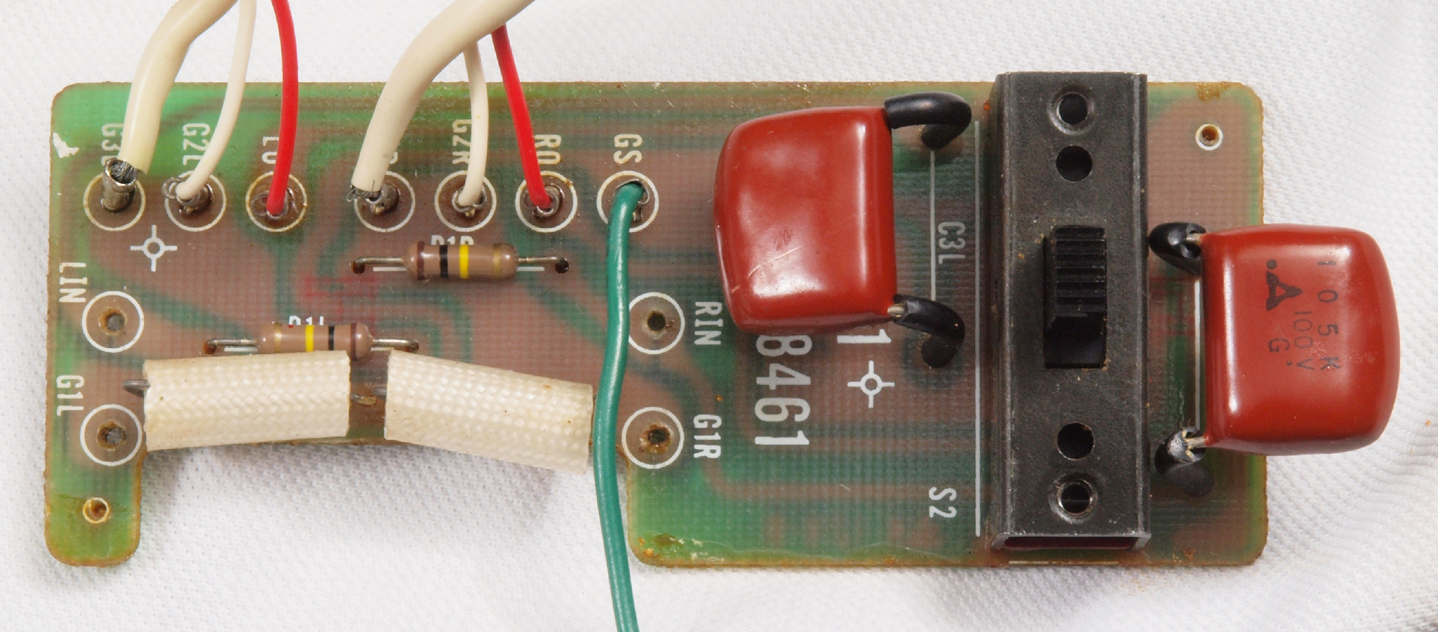 | C66. 修理後 入力RCA端子基板。 フイルムコンデンサー2個交換。 |