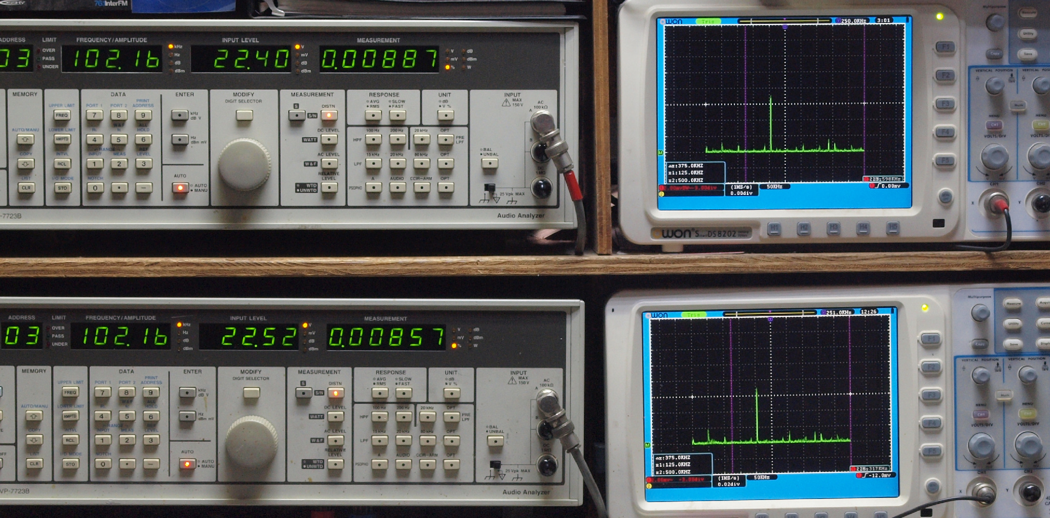 | E. 測定・調整。 画像をクリックすると、大きく(横幅2050ドット)表示されます。 E1. 出力・歪み率測定・調整 「見方」。 上段中 右側SP出力を「Audio Analyzer Panasonic VP−7723B」により測定。 表示LED、 左端=メモリーNo、 中左=周波数測定、 中右=出力電圧測定、 右端=歪み率測定。 上段右端 VP−7723Bの基本波除去出力を「owon SDS8202(200MHZ)」で「FFT分析」表示。 下段中 左側SP出力を「Audio Analyzer Panasonic VP−7723B」により測定。 表示LED、 左端=メモリーNo、 中左=周波数測定、 中右=出力電圧測定、 右端=歪み率測定。 下段右端 VP−7723Bの基本波除去出力を「owon SDS6062(200MHZ)」で「FFT分析」表示。 下段左端 オーディオ発振器 VP−7201A より50Hz〜100kHzの信号を出し(歪み率=約0.003%)、ATT+分配器を通し、AMPに入力。 よって、ダイアル設定出力レベルより低くなります。測定機器の仕様や整備の様子はこちら、「VP−7723B」「VP−7201A」。 FFT画面の見方はこちら。 |