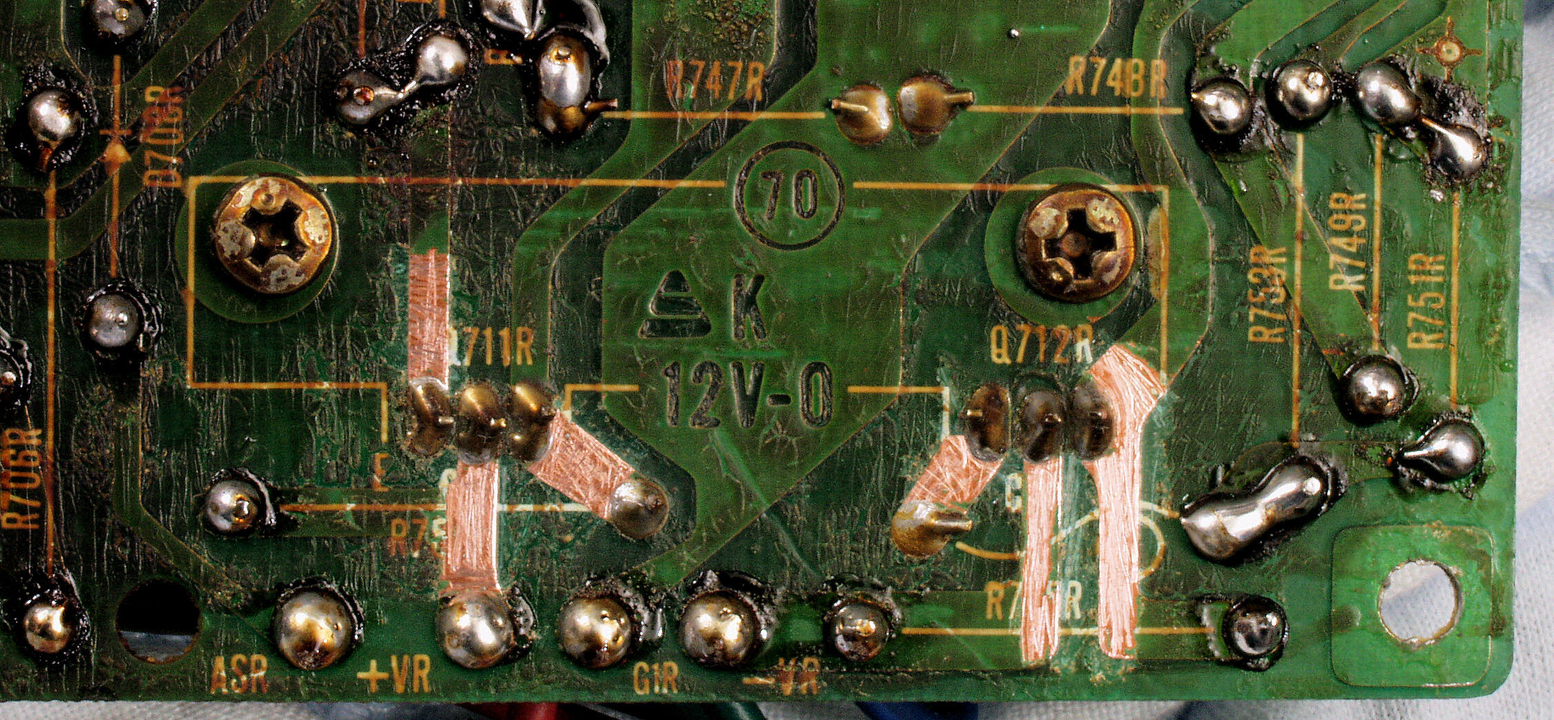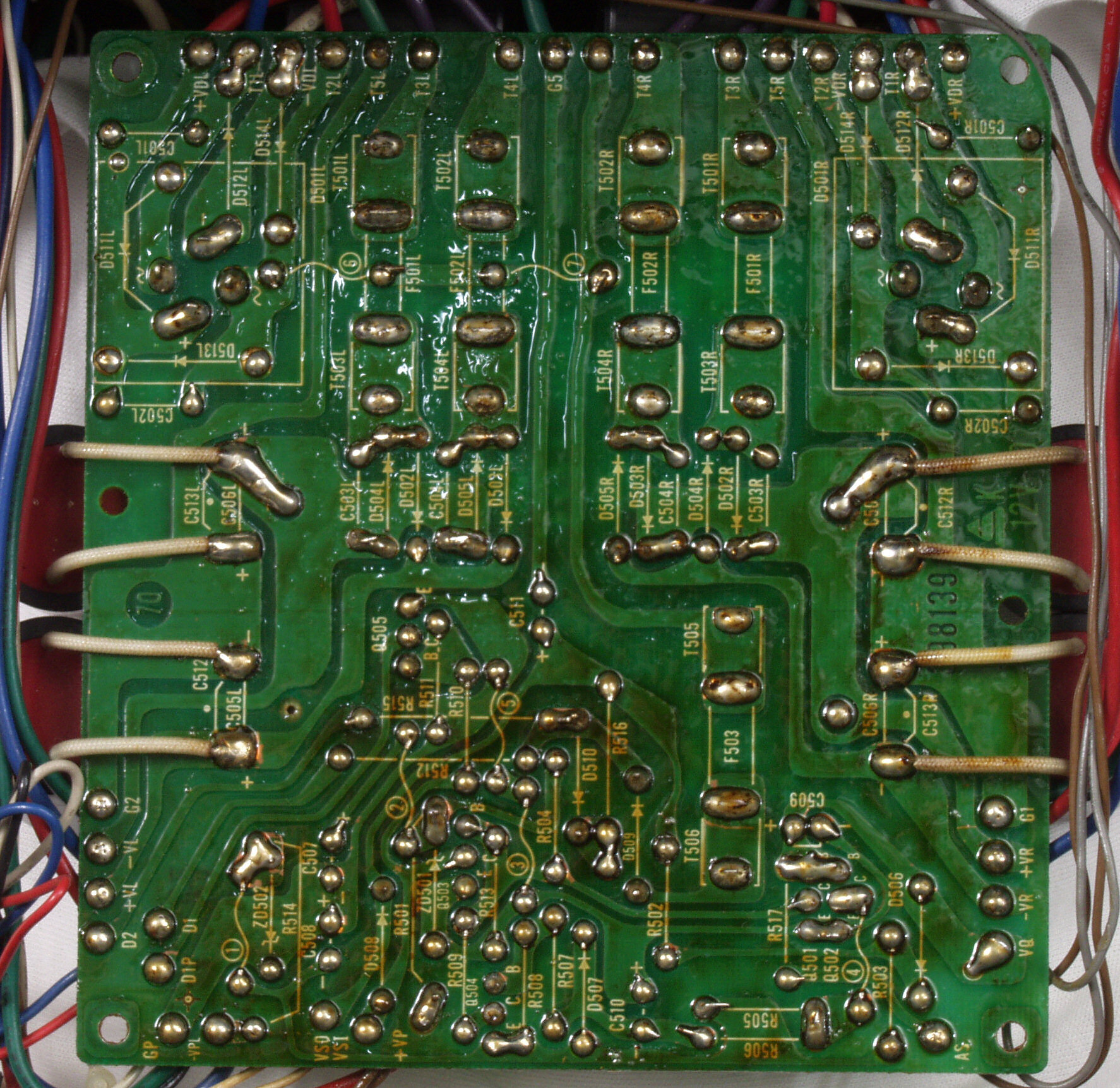 | CAF. 修理後 R側ドライブ基板−電源基板へのラッピング線に半田を浸み込ませる |