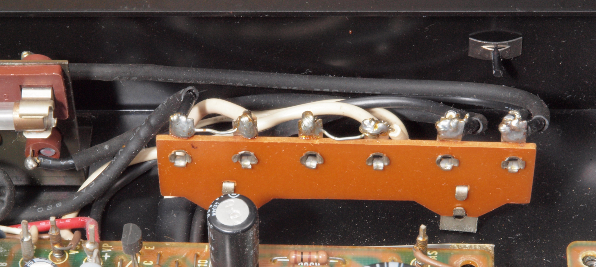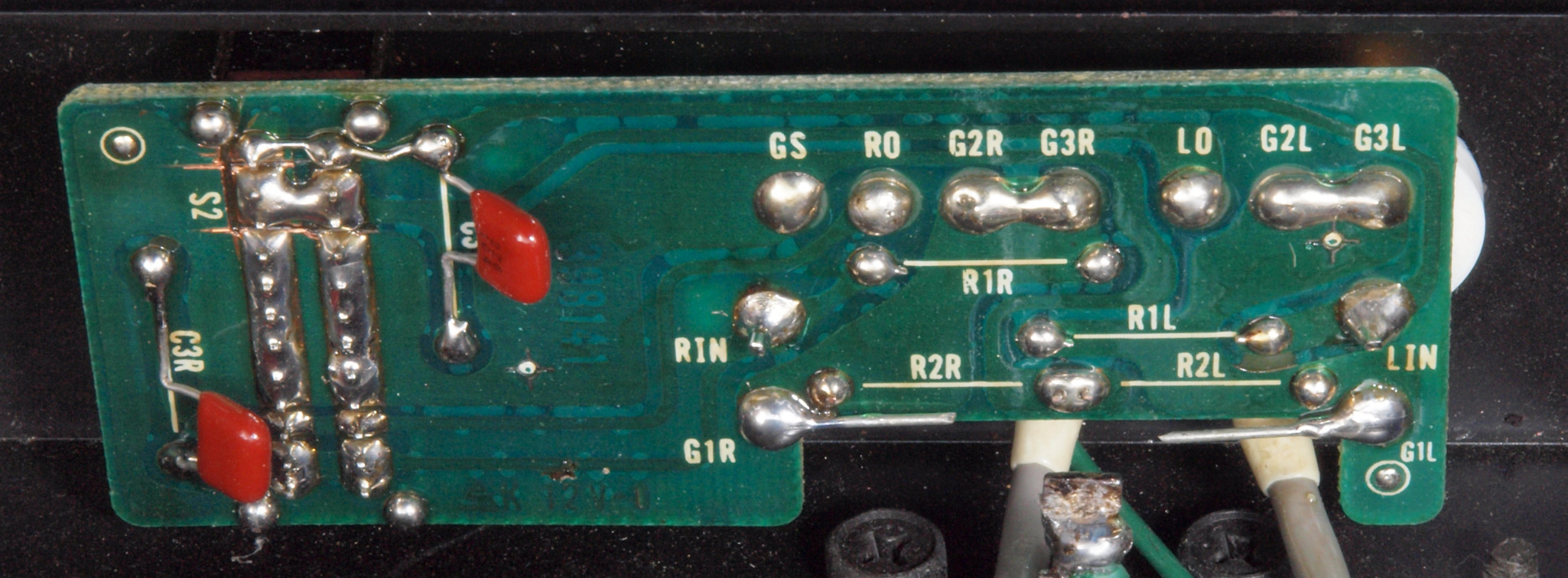 C75. 修理(半田補正)後 入力RCA端子基板裏  半田を全部やり直す。 フイルムコンデンサー2個増設。