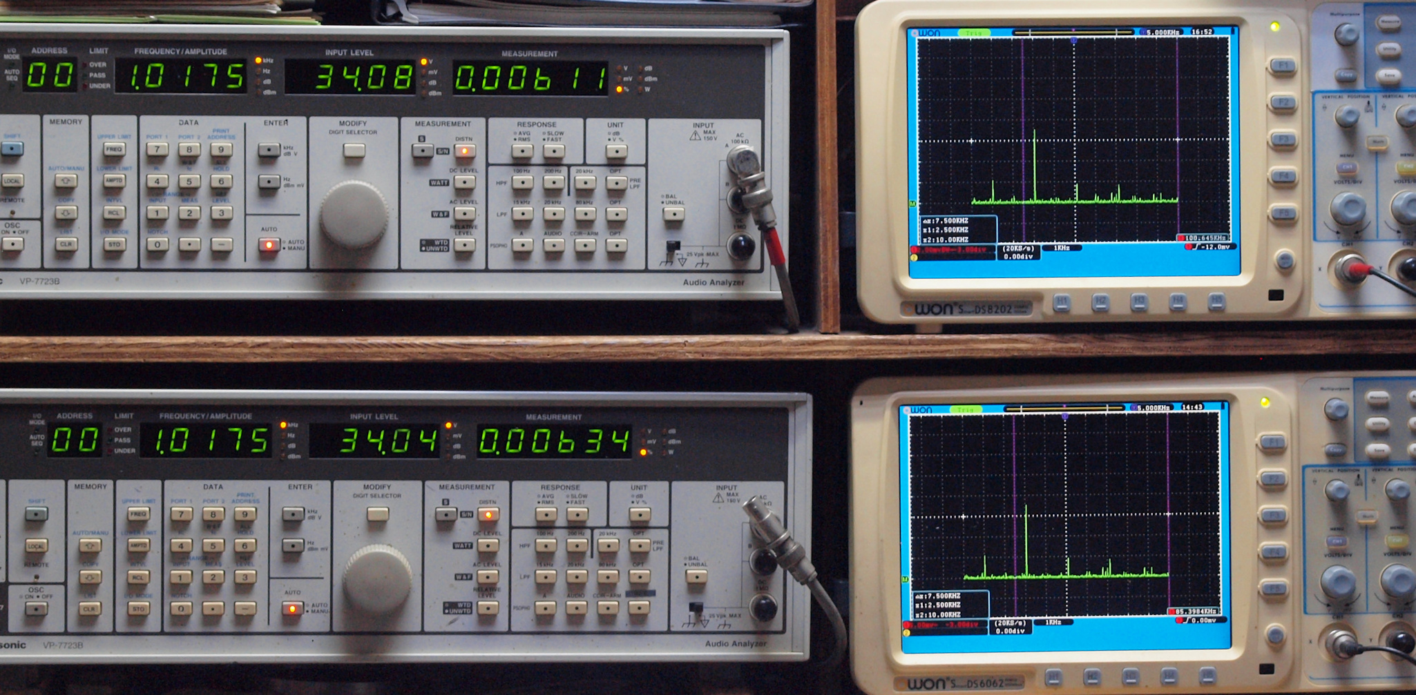 上段右端 VP−7723Bの基本波除去出力を「owon SDS8202(200MHZ)」で「FFT分析」表示。