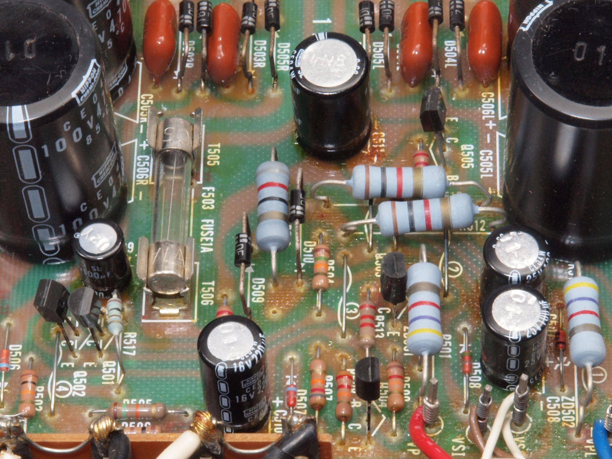 ヒューズ入り抵抗全部、電解コンデンサー11個、TR(トランジスター)2個交換、モジュール修理交換部品は除く。