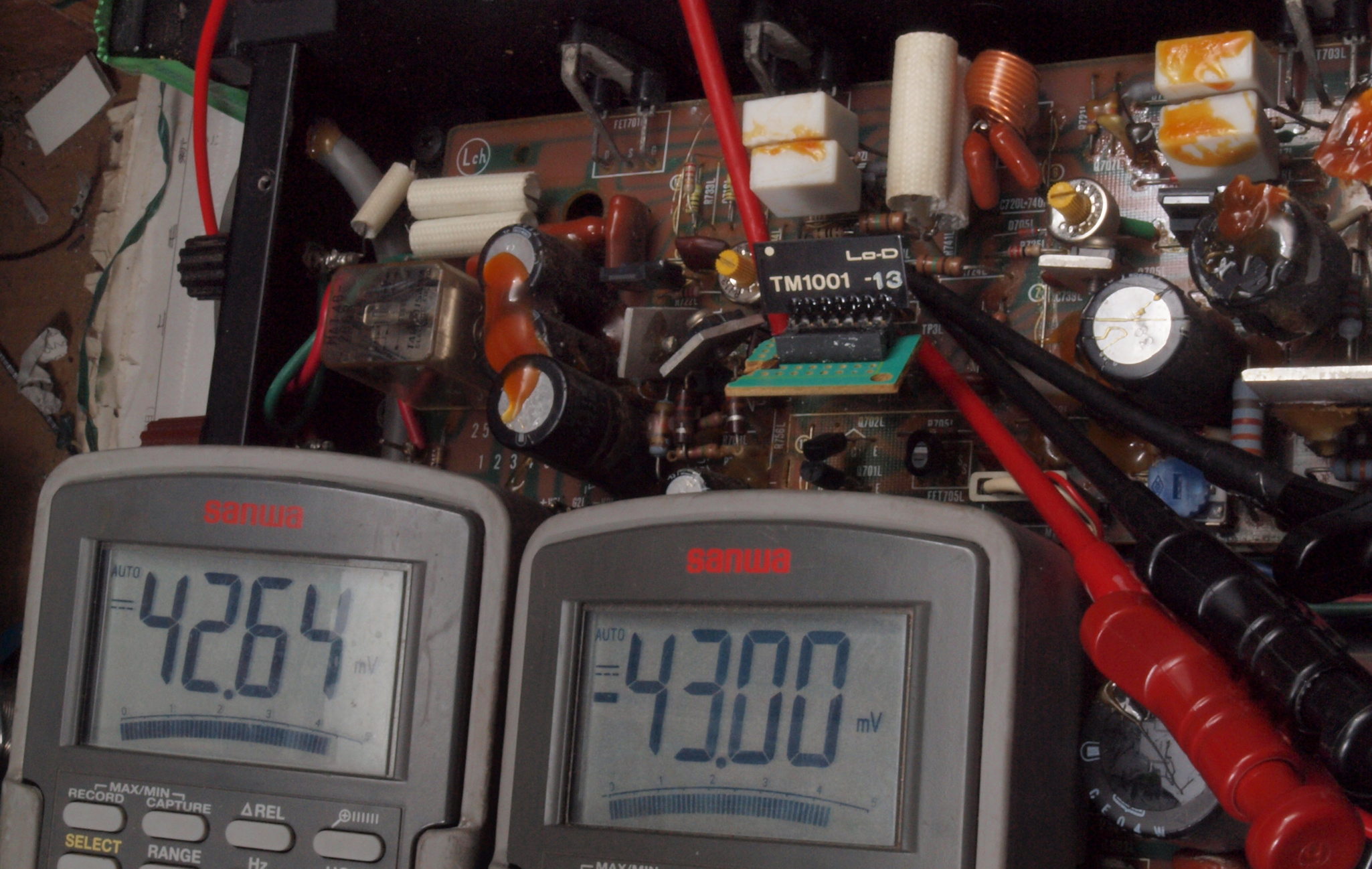 C43. 修理中 RLモジュール裏。 TR(トランジスター)6個交換し、洗浄後軽くラッカーを吹く。