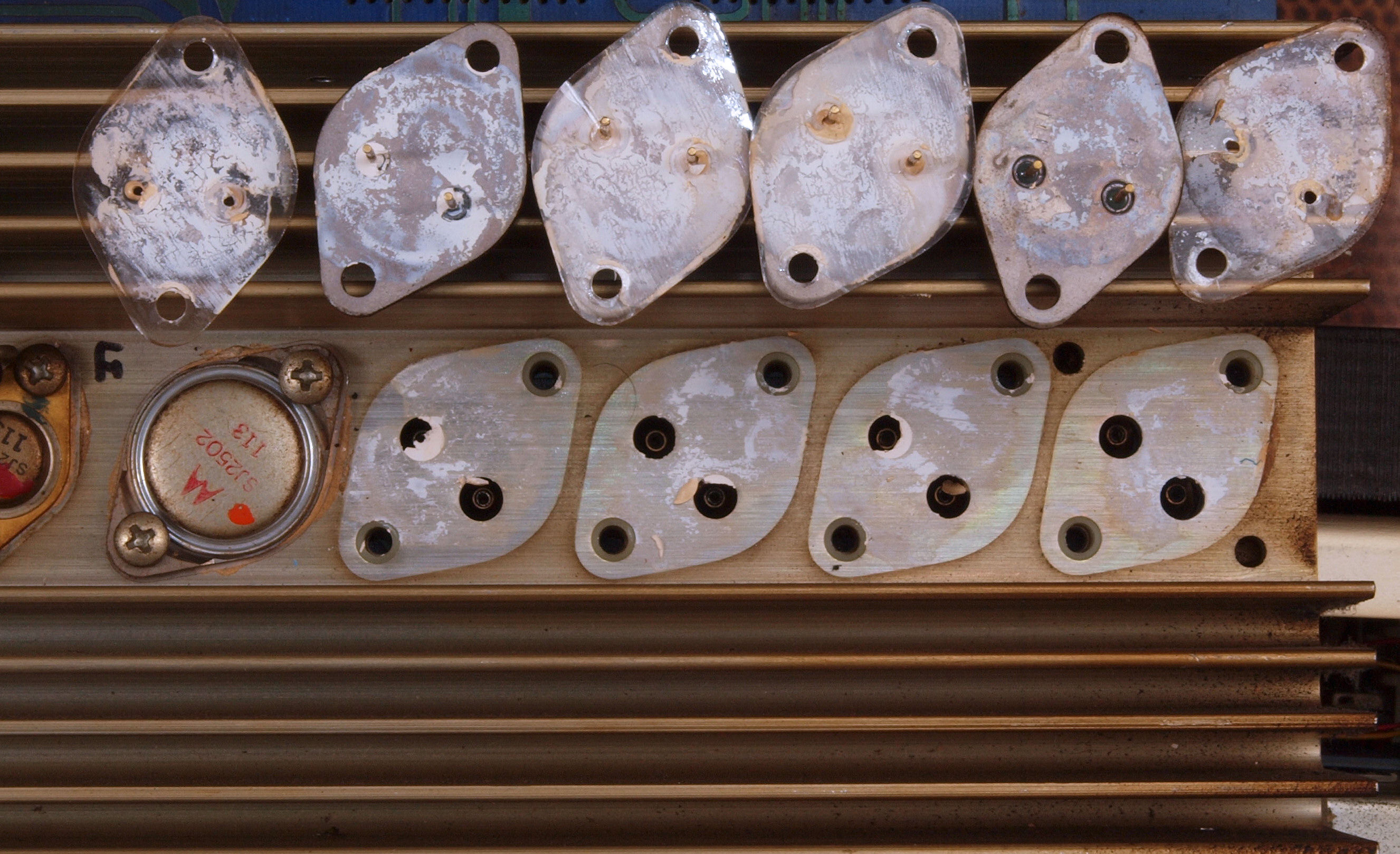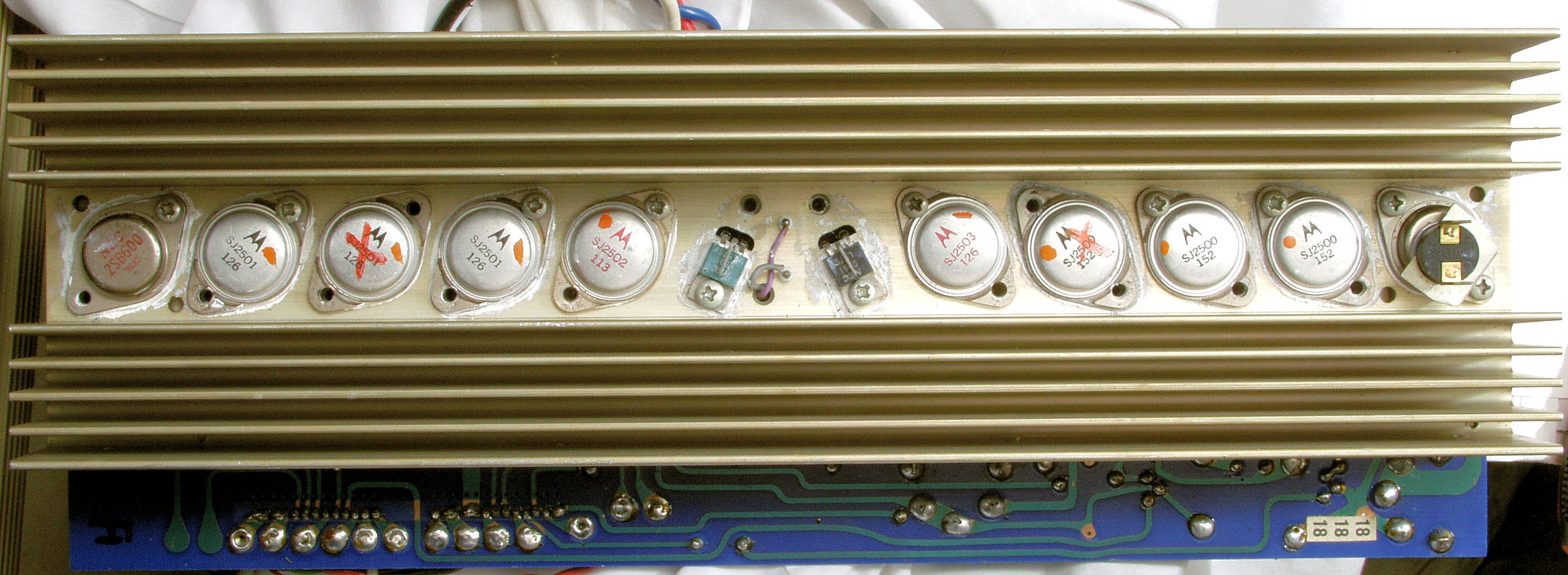 | A. 修理前の状況 A1. L側(A)終段TR(トランジスター)焼損短絡、前回の短絡故障で、ストレスを受けていたのでしょう? 部品取り用#500より、終段TR(トランジスター)を選別して交換する。 ユーザーの希望で、真ん中のモールド型プリ ドライブTR(トランジスター)も交換する。 |