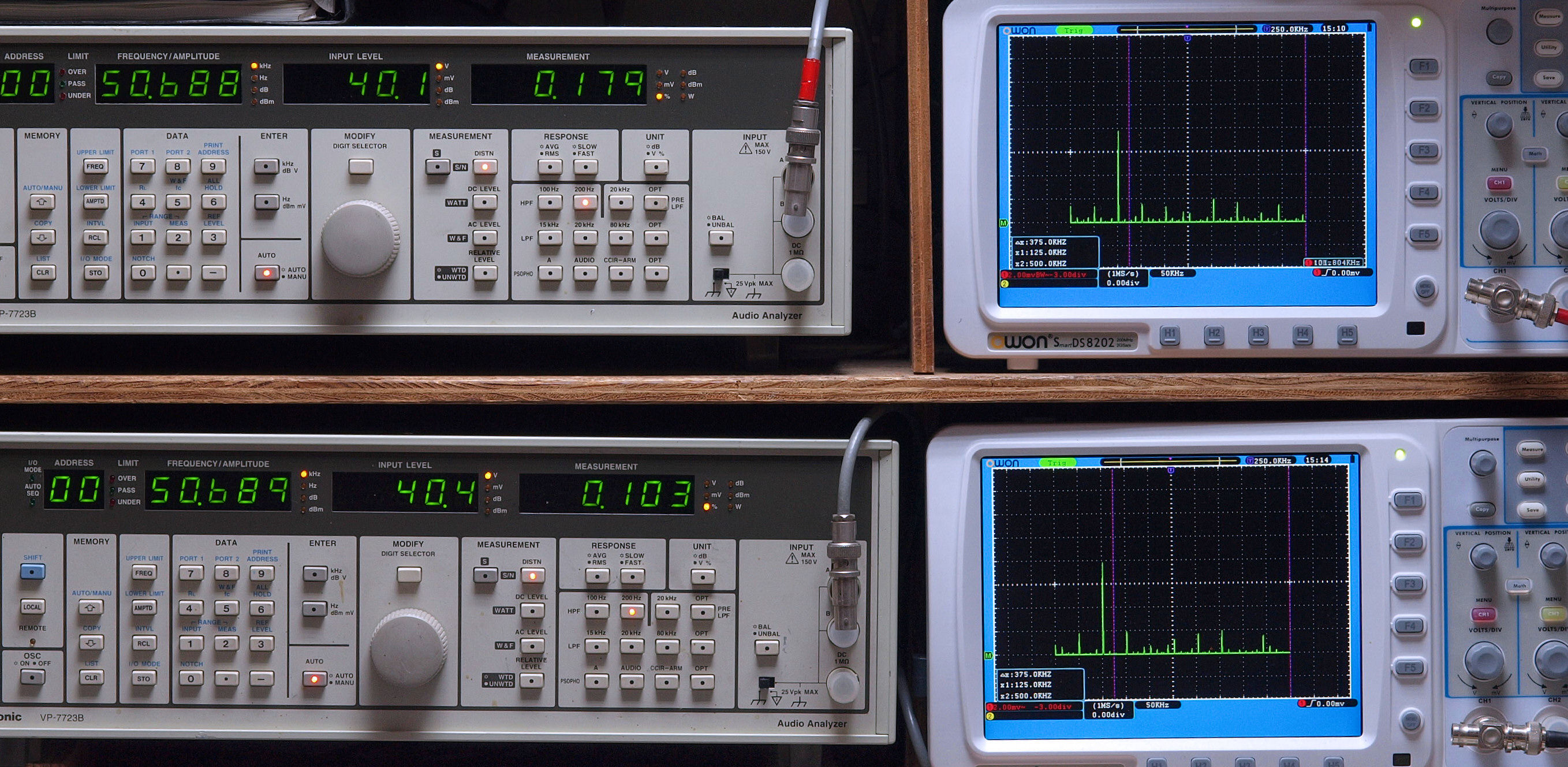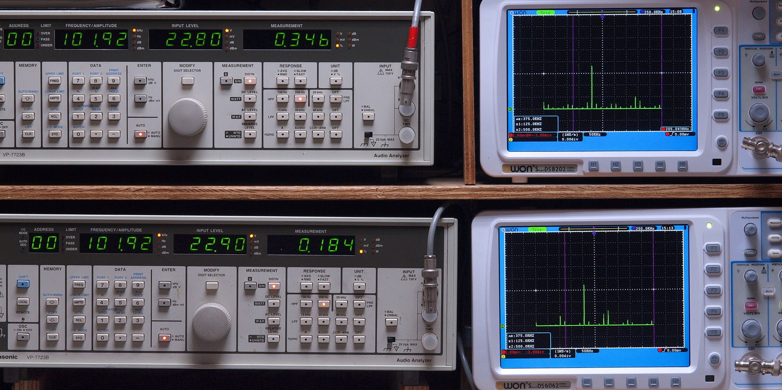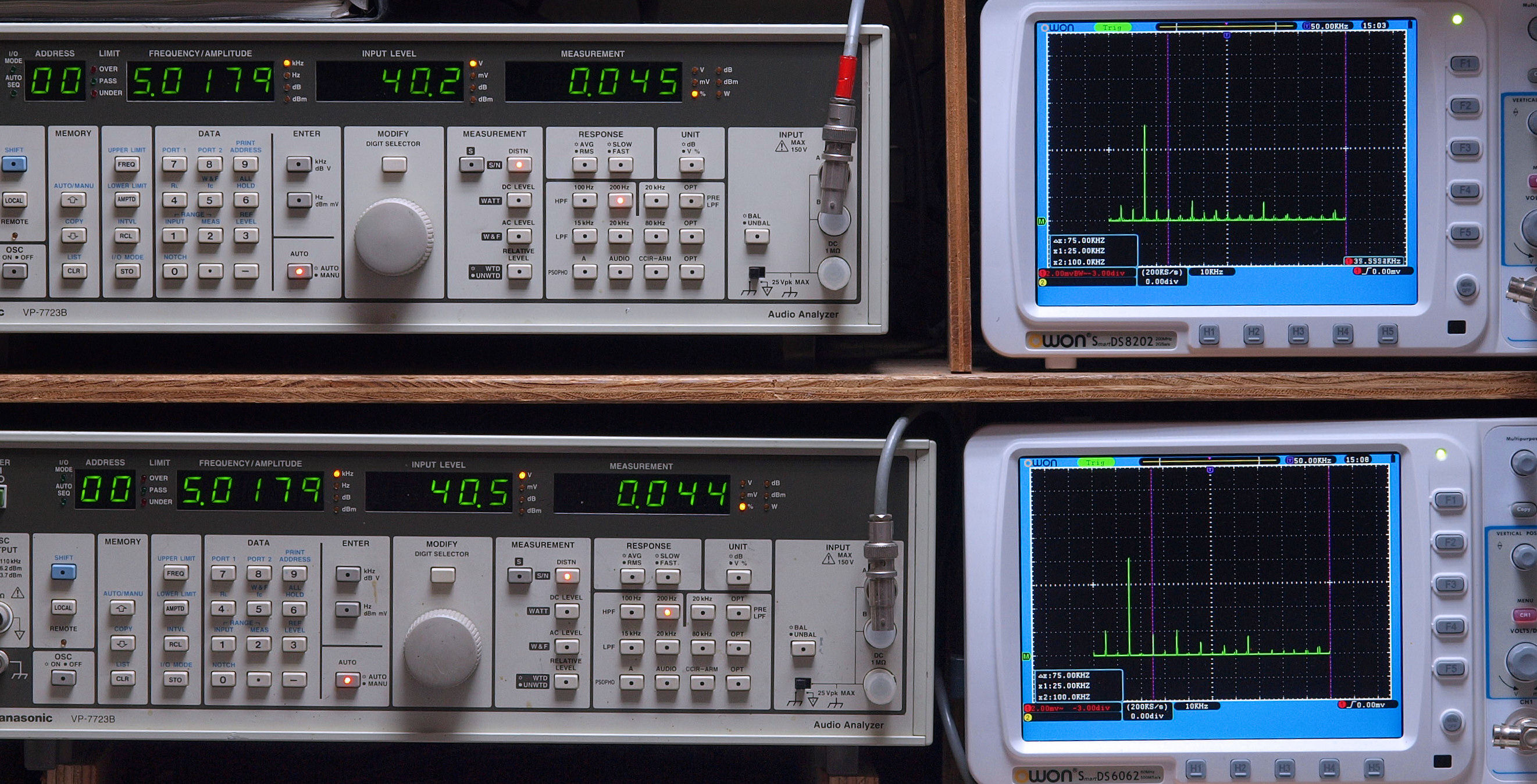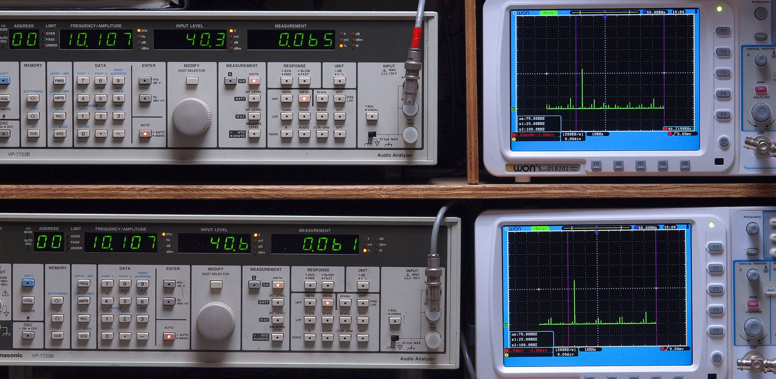 | E. 測定・調整 E1. 出力・歪み率測定・調整 「見方」。 上段中 右側SP出力を「Audio Analyzer Panasonic VP−7723B」により測定。 表示LED、 左端=メモリーNo、 中左=周波数測定、 中右=出力電圧測定、 右端=歪み率測定。 上段右端 VP−7723Bの基本波除去出力を「owon SDS8202(200MHZ)」で「FFT分析」表示。 下段中 左側SP出力を「Audio Analyzer Panasonic VP−7723B」により測定。 表示LED、 左端=メモリーNo、 中左=周波数測定、 中右=出力電圧測定、 右端=歪み率測定。 下段右端 VP−7723Bの基本波除去出力を「owon SDS6062(200MHZ)」で「FFT分析」表示。 下段左端 オーディオ発振器 VP−7201A より50Hz〜100kHzの信号を出し(歪み率=約0.003%)、ATT+分配器を通し、AMPに入力。 よって、ダイアル設定出力レベルより低くなります。測定機器の仕様や整備の様子はこちら、「VP−7723B」「VP−7201A」。 FFT画面の見方はこちら。 |