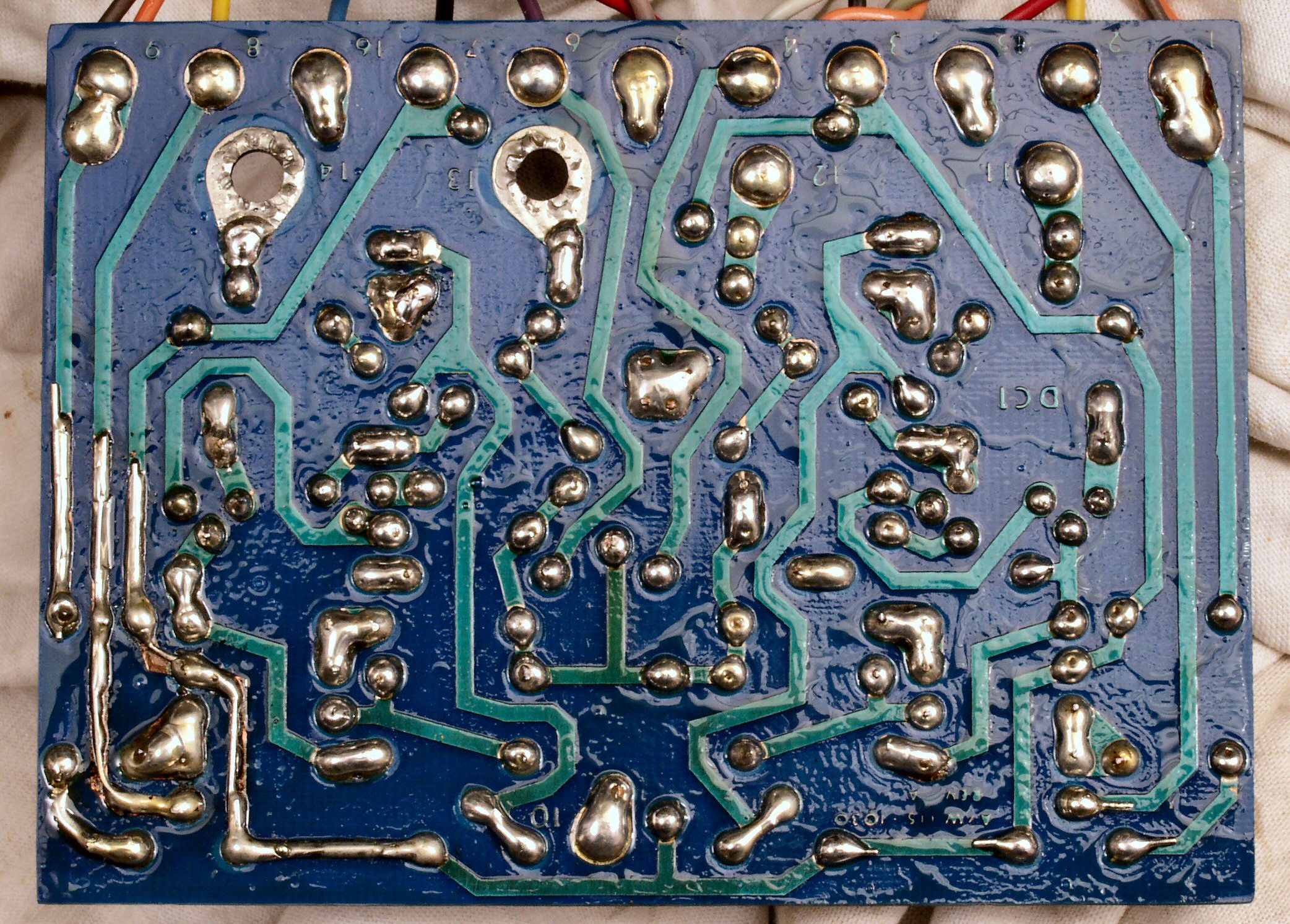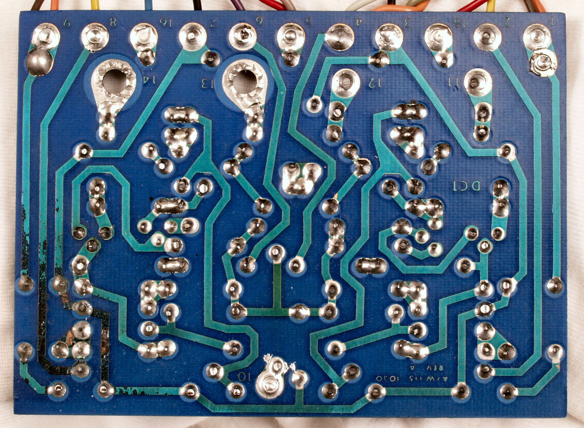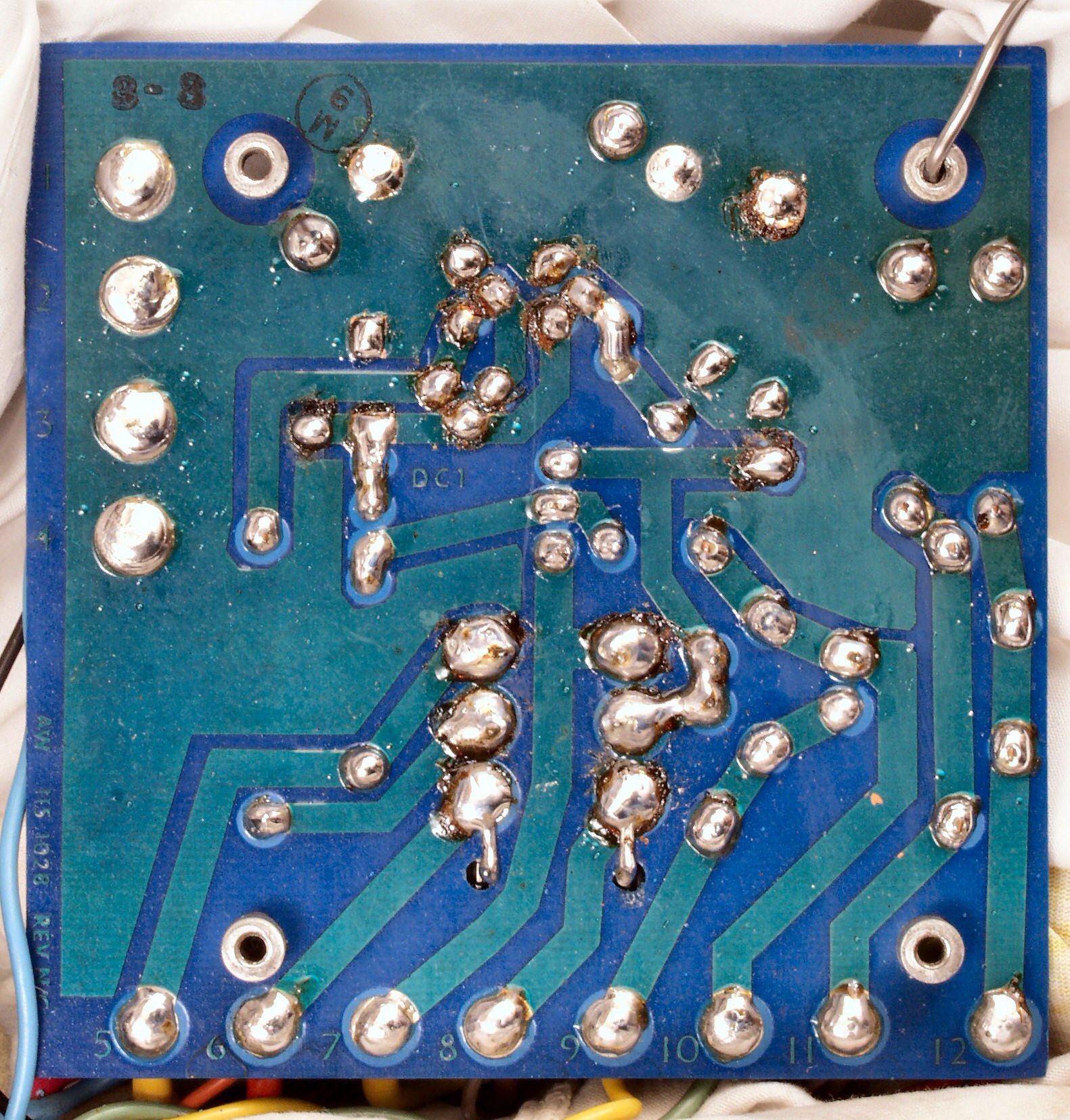 | C−4D. 修理(半田補正)後 VU基板裏,、腐食した銅箔はメッキ線で補修する。 | ||||||||||||||||||||||||||||||