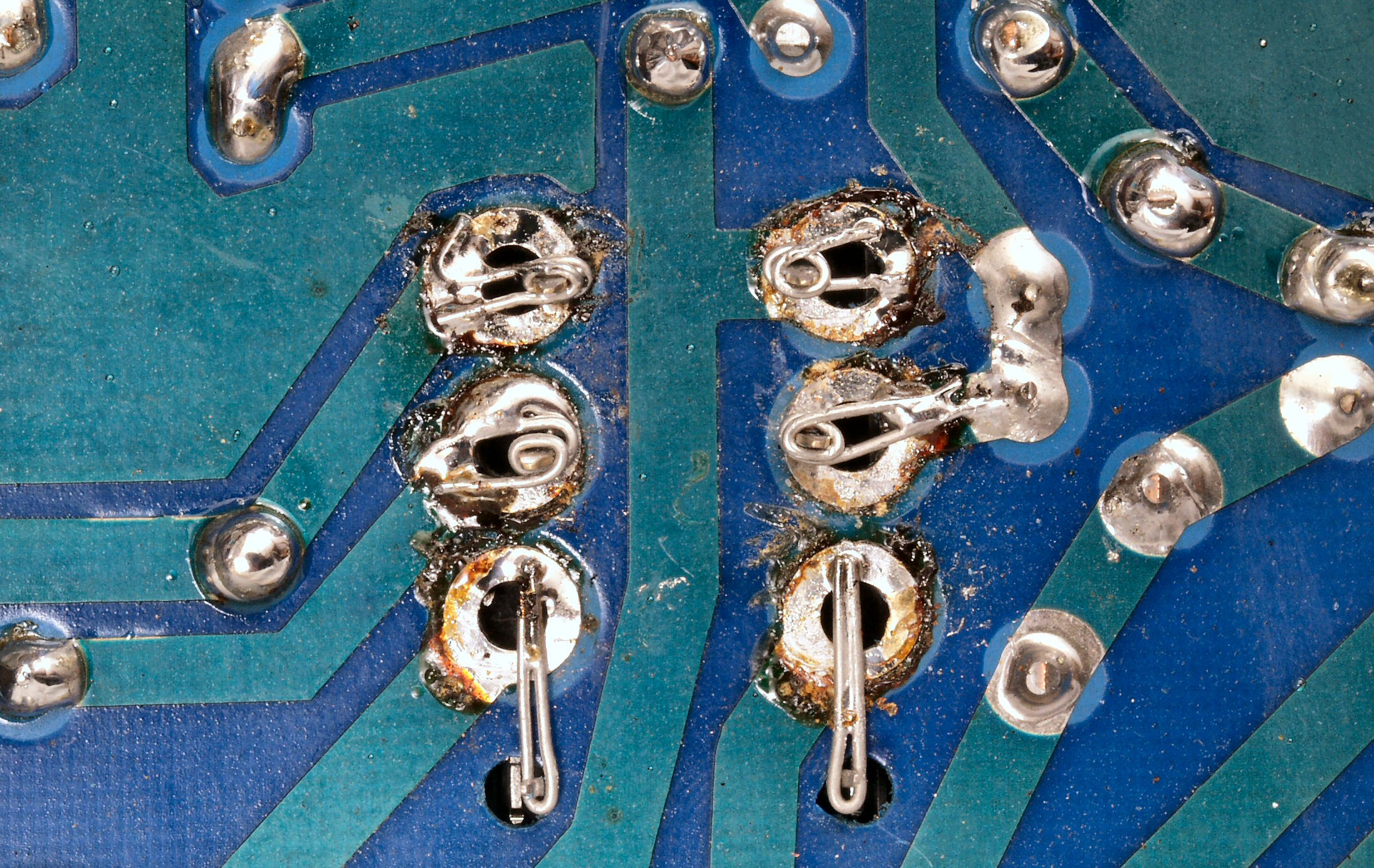 | C−4C−1. 修理前 VU基板裏 接点復活剤の使用で腐食した銅箔、右下はは半田屑が付いている | ||||||||||||||||||||||||||||||
