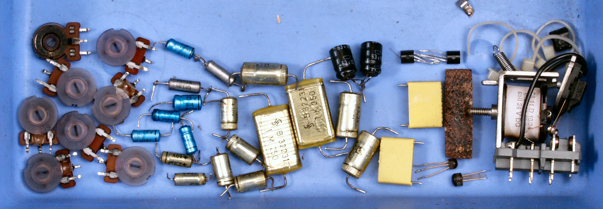| C−2D. 修理後 L側AMP基板 TR(トランジスター)3個、電解コンンサー4個、半固定VR2個、フイルムコンデンンサー2個交換 | ||||||||||||||||||||||||||||||