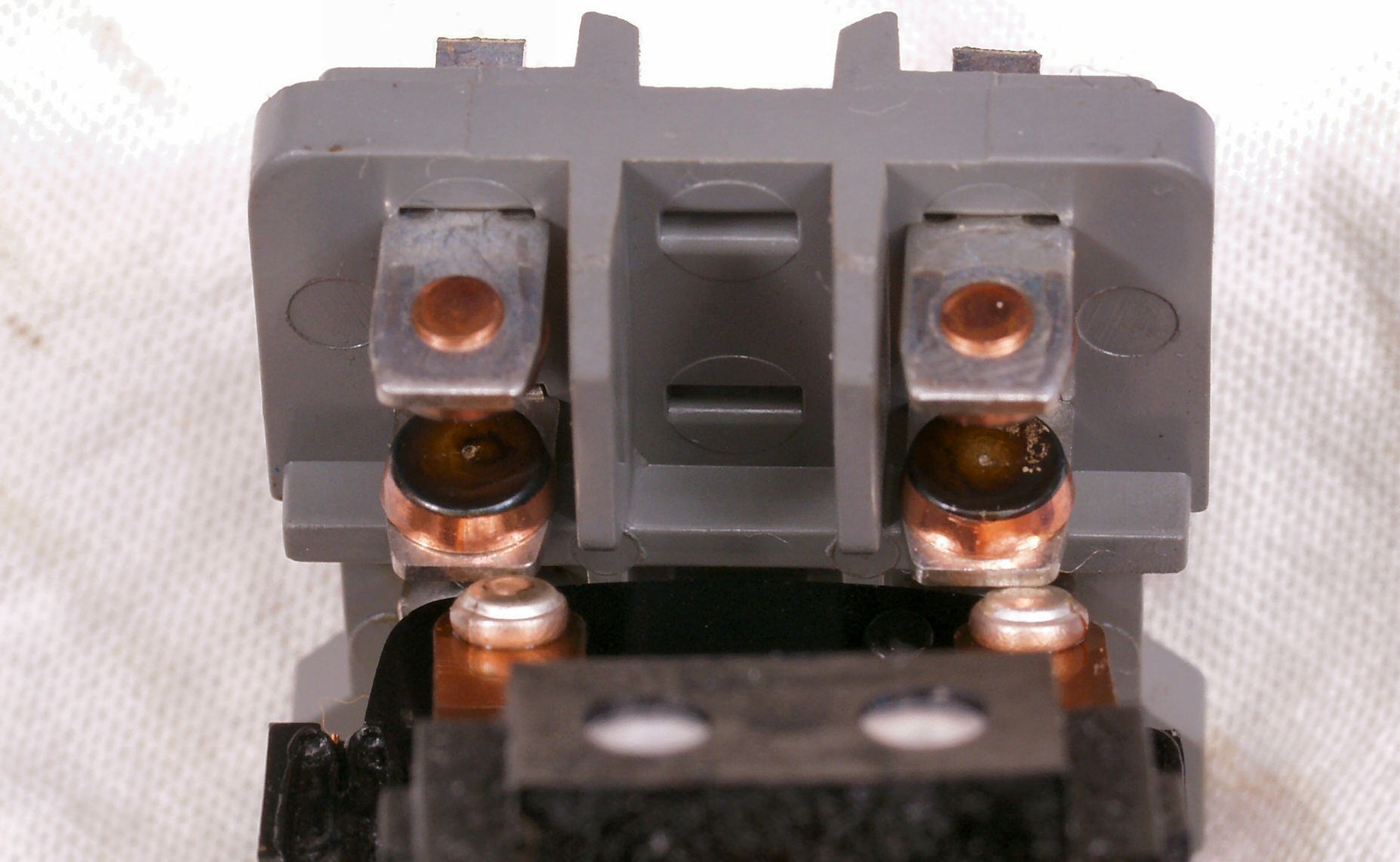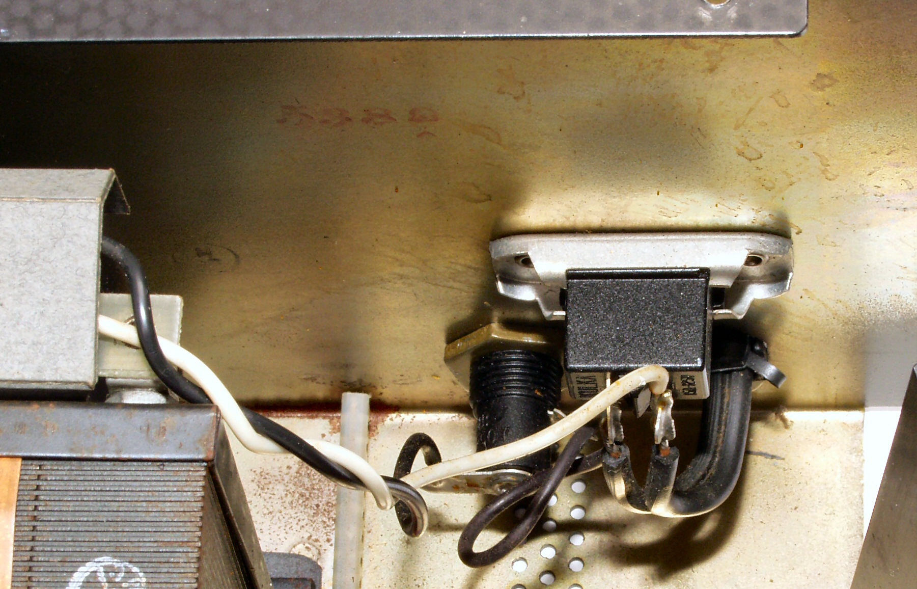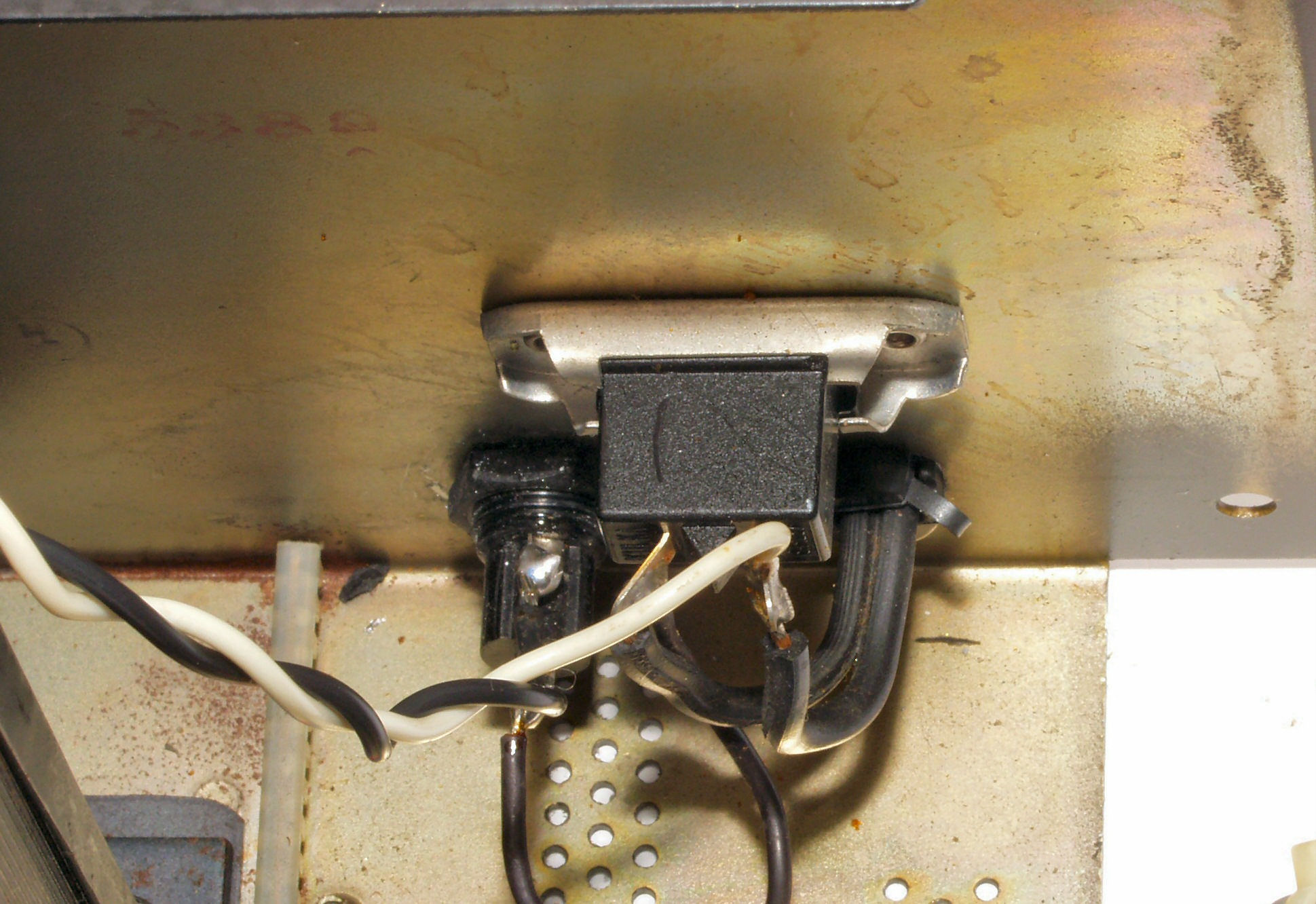 | C−6A. 修理前 、フューズホルダー、狭いところなので取り外しが大変!! 上のコンセントが、ネジ止めでなく、リベットのカシメなので、手が入らない。 |