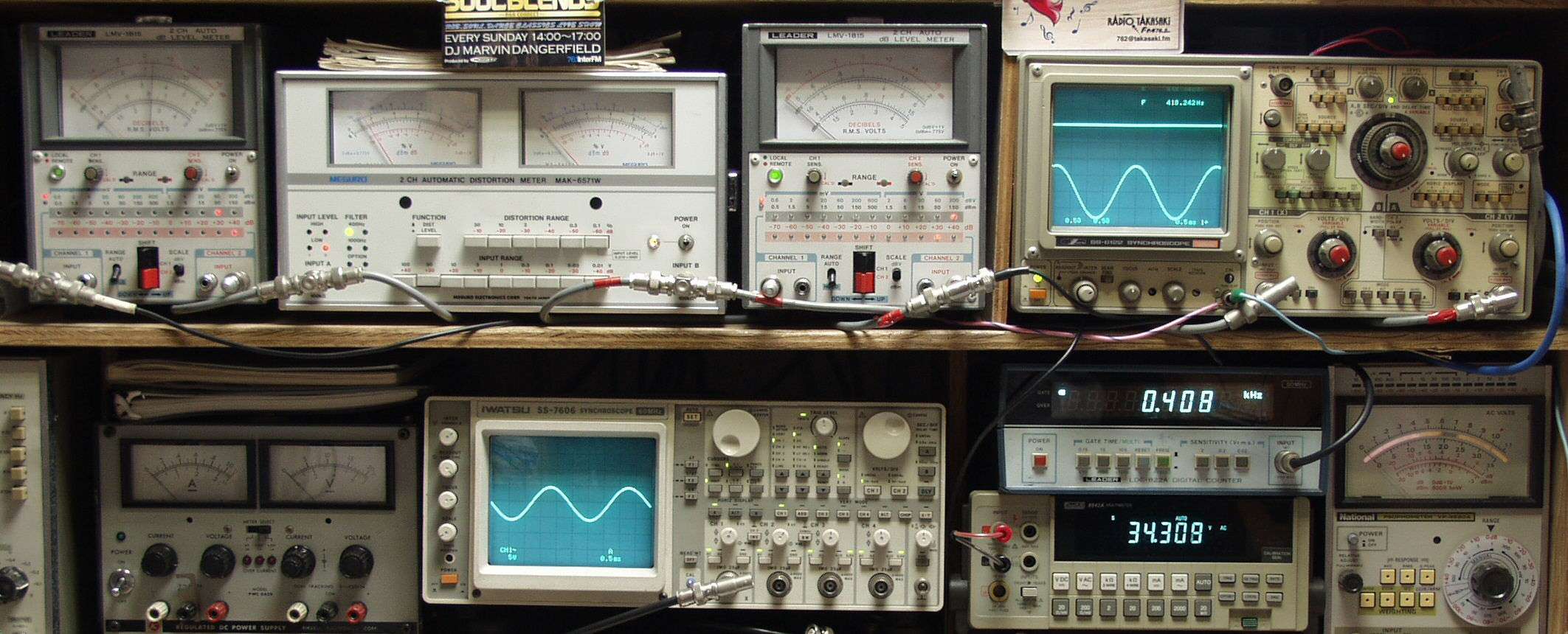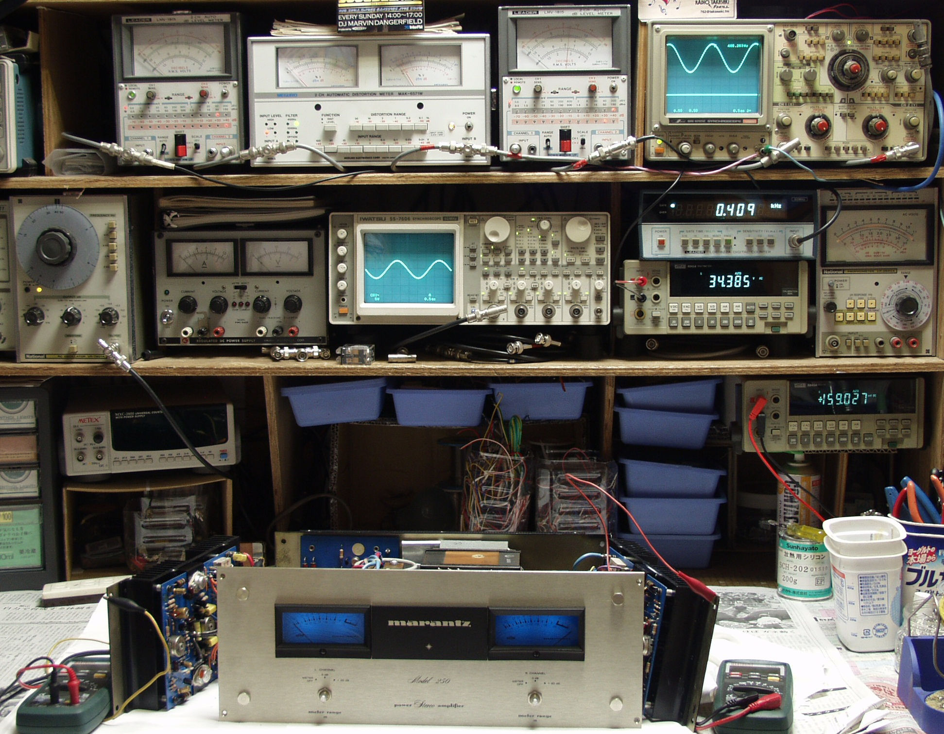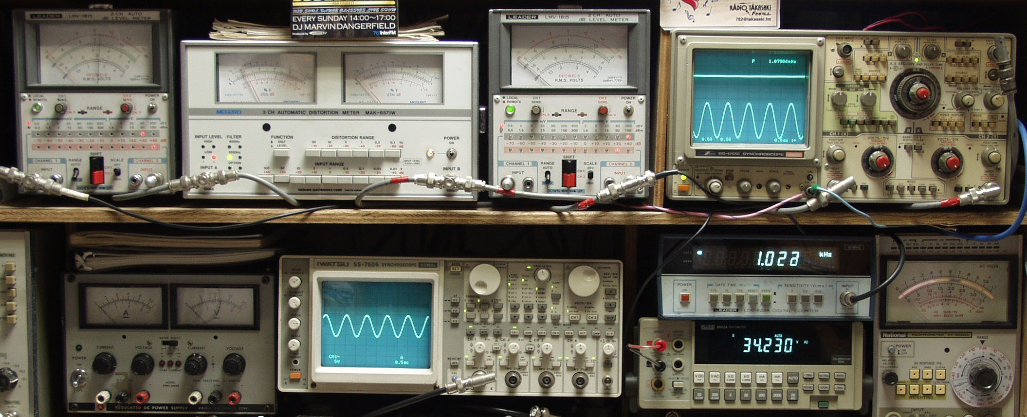 | E. 調整・測定 E−1. 出力/歪み率測定・調整 <見方> 下左オーディオ発振器より400HZ&1KHZの信号を出す(歪み率=約0.003%)。 下中=入力波形(オーディオ発振器のTTLレベル)。 下右=周波数計。 上左=SP出力の歪み率測定。 左メータ=L出力。 右メータ=R出力。 上中=SP出力電圧測定器。 赤針=R出力。 黒針=L出力 上右=SP出力波形オシロ。 上=R出力。 下=L出力(出力電圧測定器の出力)。 ユーザーの要望で電源電圧100Vで調整・測定。 |