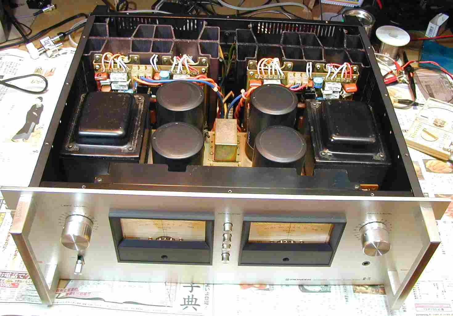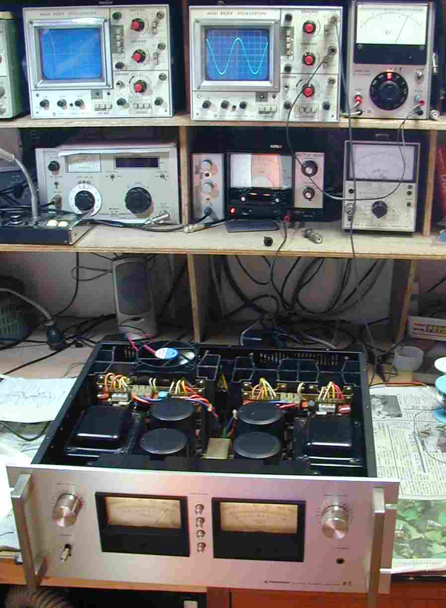 | A. 修理前の状況 プロテクトが働き、解除しない。 B. 原因 終段TR(トランジスター)の劣化 C. 修理状況 調整用 半固定VR交換 終段TR(トランジスター)交換 TR(トランジスター)、FET(電界トランジスター)交換、 FET(電界トランジスター) 交換 配線手直し、補強 D. 使用部品 終段TR(トランジスター) 8個 バランス、バイアス調整用 半固定VR 8個 TR(トランジスター) 4個 FET(電界トランジスター) 2個 E. 修理費 74,500円 通常修理。 S. Pioneer M−75 の仕様(マニアル・カタログより) |