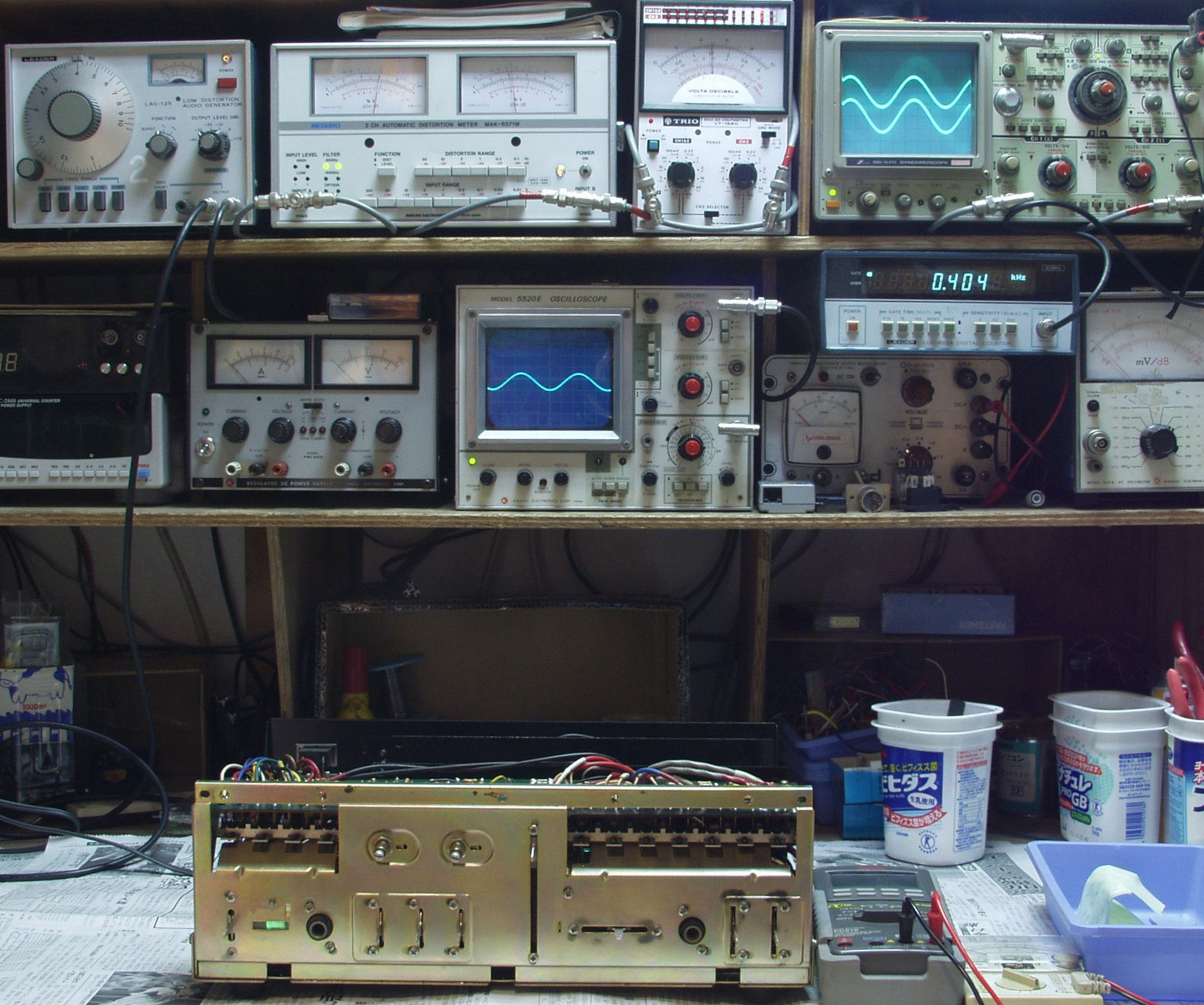| E. 調整・測定 E1. 出力/歪み率測定・調整 <見方> 上左オーディオ発振器より400HZ・1KHZの信号を出す(歪み率=約0.003%) 下中=入力波形(オーディオ発振器のTTLレベル) 下右=周波数計 上左=SP出力の歪み率測定 左メータ=L出力、右メータ=R出力 上中=SP出力電圧測定器、赤針=R出力、黒針=L出力 上右=SP出力波形オシロ 上=R出力、下=L出力(出力電圧測定器の出力) |