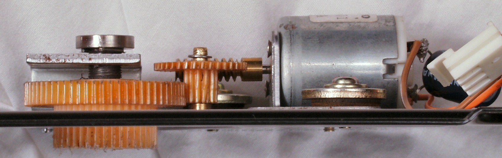 A−1. 点検中 ドロワー(引き出し)駆動部、真ん中の平歯車のした歯車が割れている