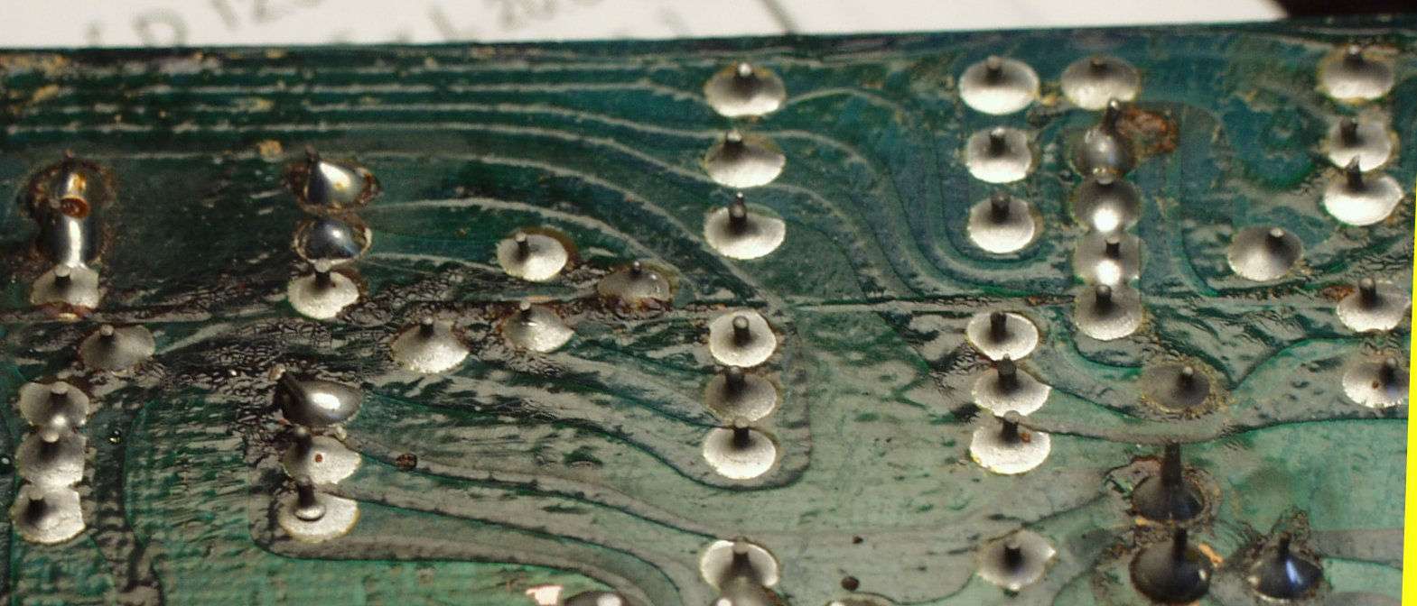 | C4C1. 修理前 電源1基盤裏 半田不良拡大部分1 熱でボロボロ | ||||||||||||||||||||||||||||||||||||||||||||||||||||