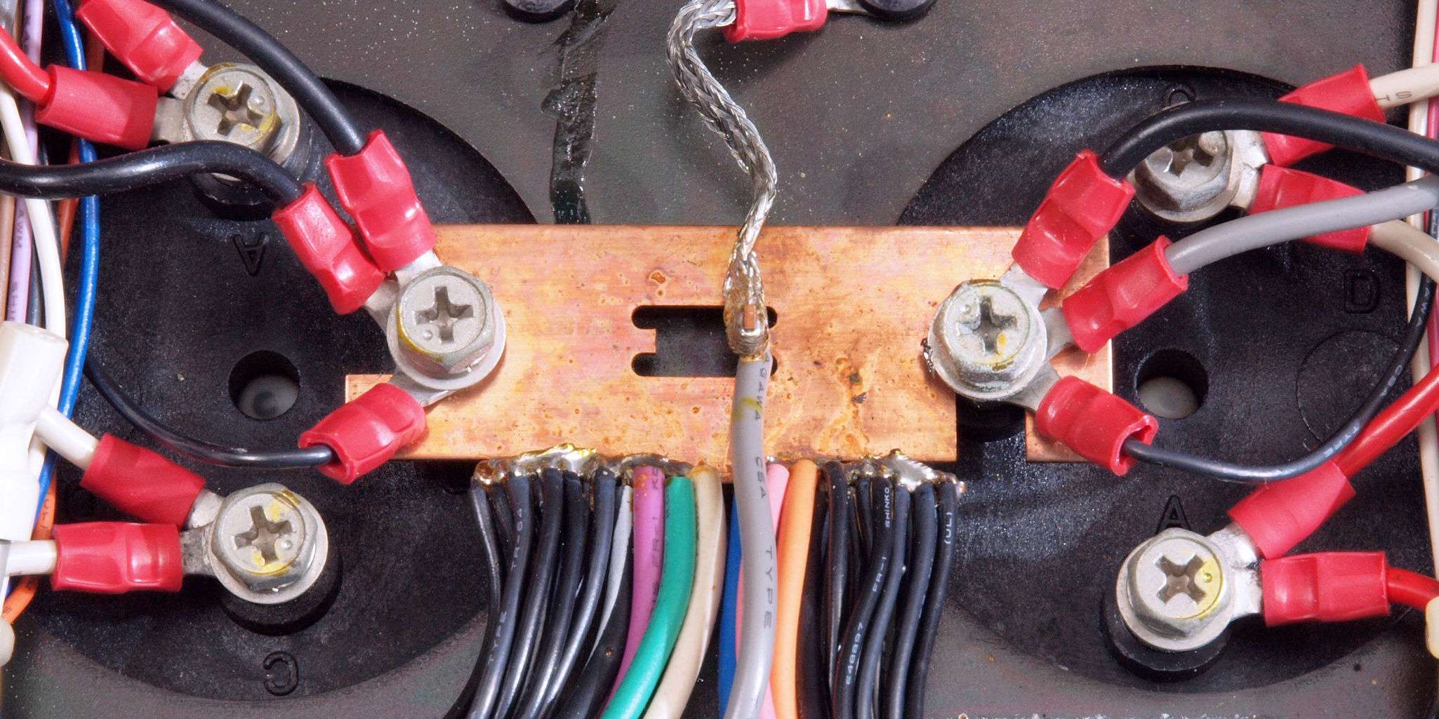 | CF3. 修理中 3Pプラグにケーブル取り付。 差し込み固定が一般ですが、時計方向に巻き付けると良い。 上のK線=巻き付いた端側、 下の白線=挿入した側。止めビスは未締結です。 これで差し込み固定の3倍位接触面積が増し、接触抵抗が低くなる。 |