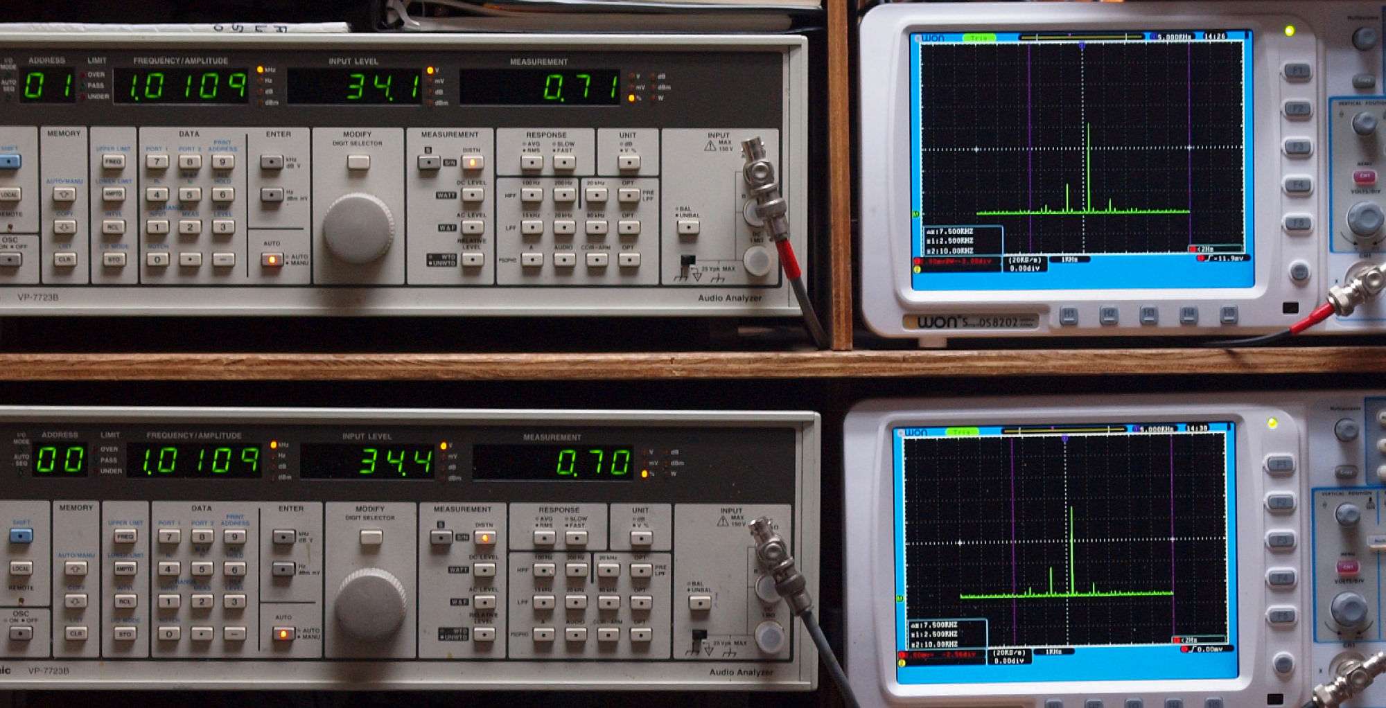 | E. 測定・調整 E1. 出力・歪み率測定・調整 「見方」。 上段中 右側SP出力を「Audio Analyzer Panasonic VP−7723B」により測定。 表示LED、 左端=メモリーNo、 中左=周波数測定、 中右=出力電圧測定、 右端=歪み率測定。 上段右端 VP−7723Bの基本波除去出力を「owon SDS8202(200MHZ)」で「FFT分析」表示。 下段中 左側SP出力を「Audio Analyzer Panasonic VP−7723B」により測定。 表示LED、 左端=メモリーNo、 中左=周波数測定、 中右=出力電圧測定、 右端=歪み率測定。 下段右端 VP−7723Bの基本波除去出力を「owon SDS6062(200MHZ)」で「FFT分析」表示。 下段左端 オーディオ発振器 VP−7201A より50Hz〜100kHzの信号を出し(歪み率=約0.003%)、ATT+分配器を通し、AMPに入力。 よって、ダイアル設定出力レベルより低くなります。測定機器の仕様や整備の様子はこちら、「VP−7723B」「VP−7201A」。 FFT画面の見方はこちら。 右は、AC100V入力電圧可変(スライダック)、アイドル電流設定に使用する。 |