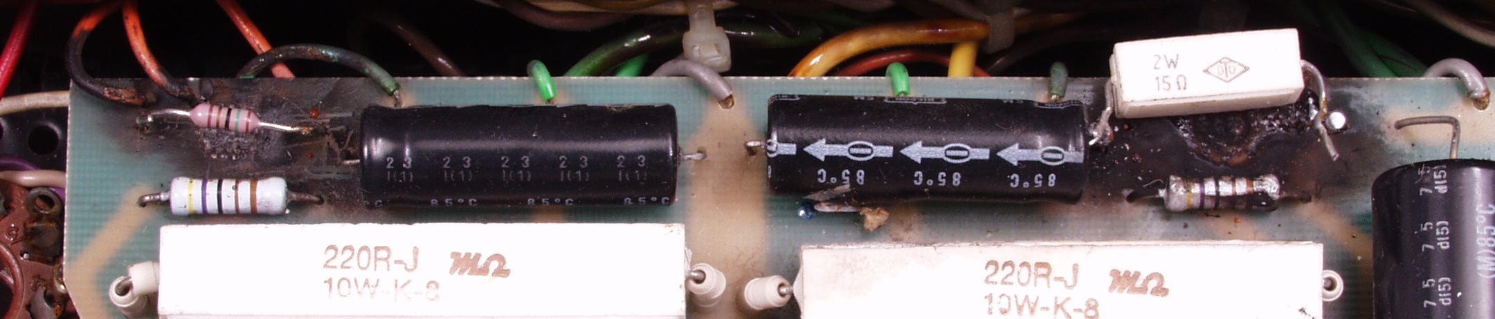 | A−5A. 修理前点検中. 焼けて交換した抵抗、RLで異なる |