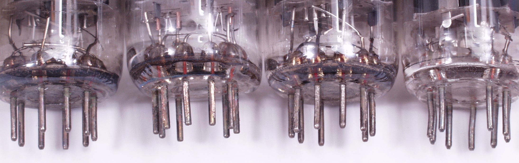 | A−6B. 修理前点検中 MT真空管は足の付け根(袴の部分)を見ると、新旧が歴然と解る 左=少し使用、中左=未使用新品、他は中古品 |