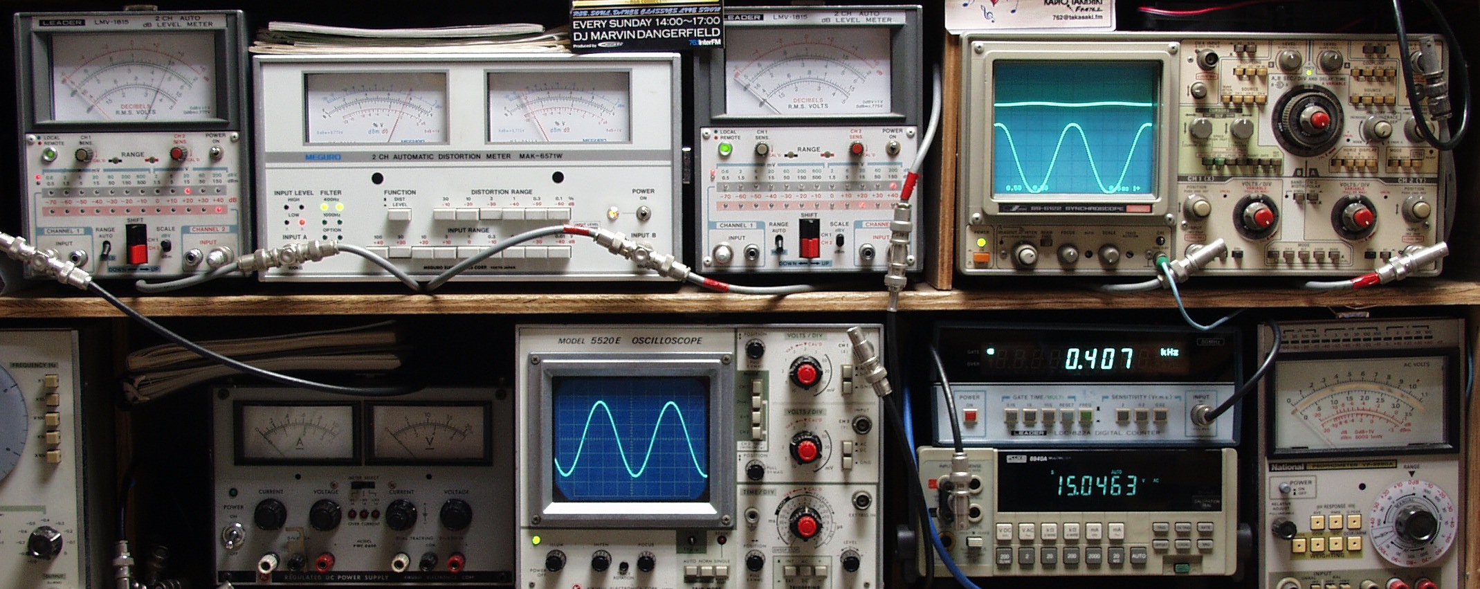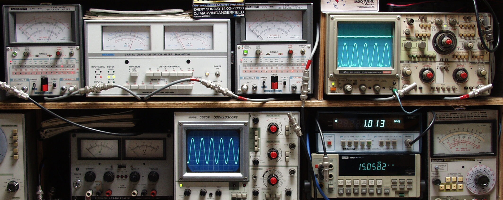 | E. 測定・調整 E−1. 出力・歪み率測定・調整 <見方> 下左オーディオ発振器より400HZ・1KHZの信号を出し(歪み率=約0.003%)これをAMPに入力し、SPからの出力を測定 下中オシロ=入力波形(オーディオ発振器のTTLレベル) 下右上=周波数計 上左端電圧計=L側SP出力電圧測定、黒針のみ使用 上中左歪み率計=SP出力の歪み率測定 左メータ=L出力、右メータ=R出力 上中右=R側SP出力電圧測定、赤針のみ使用 上右端オシロ=SP出力波形 上=R出力、下=L出力 下中右上デジタル電圧計=SP出力電圧測定RLは切り替えて測定 |